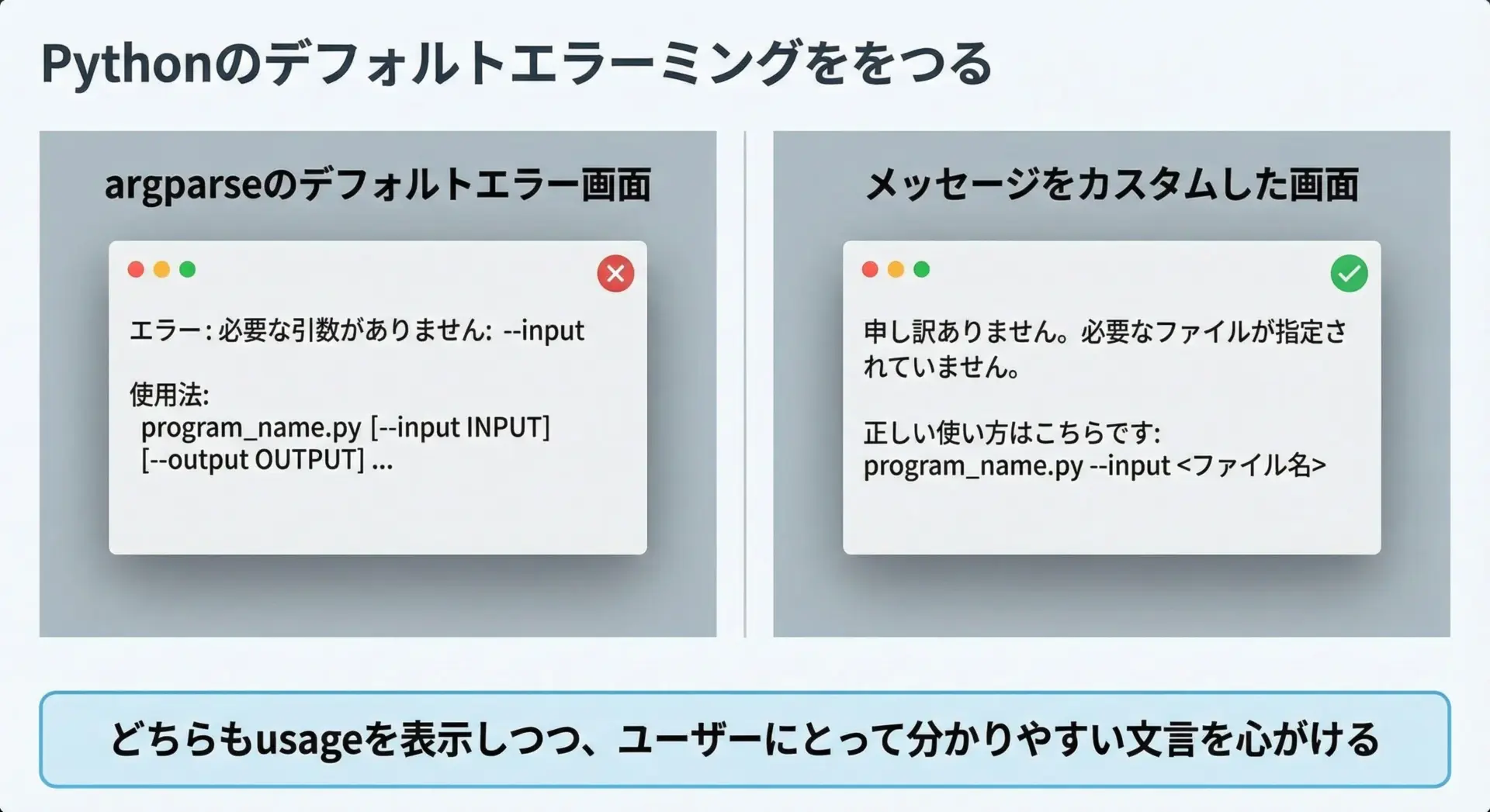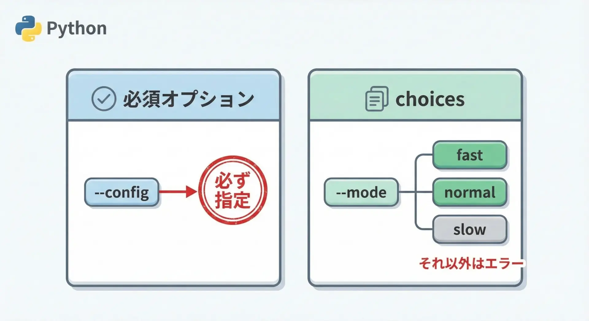 このような場面で、argparseを使うと「使いやすく、間違えにくい」CLIを作ることができます。