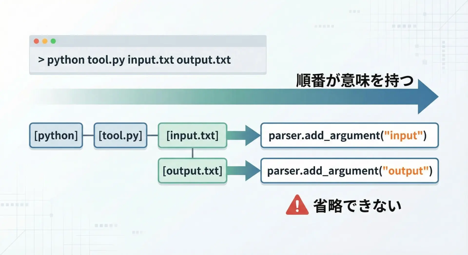 このように、位置引数は「これがなければ動作しない必須情報」を表現するのに向いています