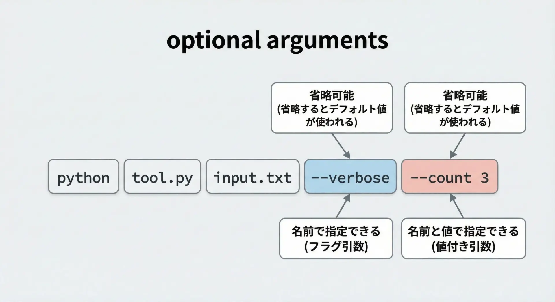 オプション引数(option arguments)は、---で始まる、任意指定の引数です。