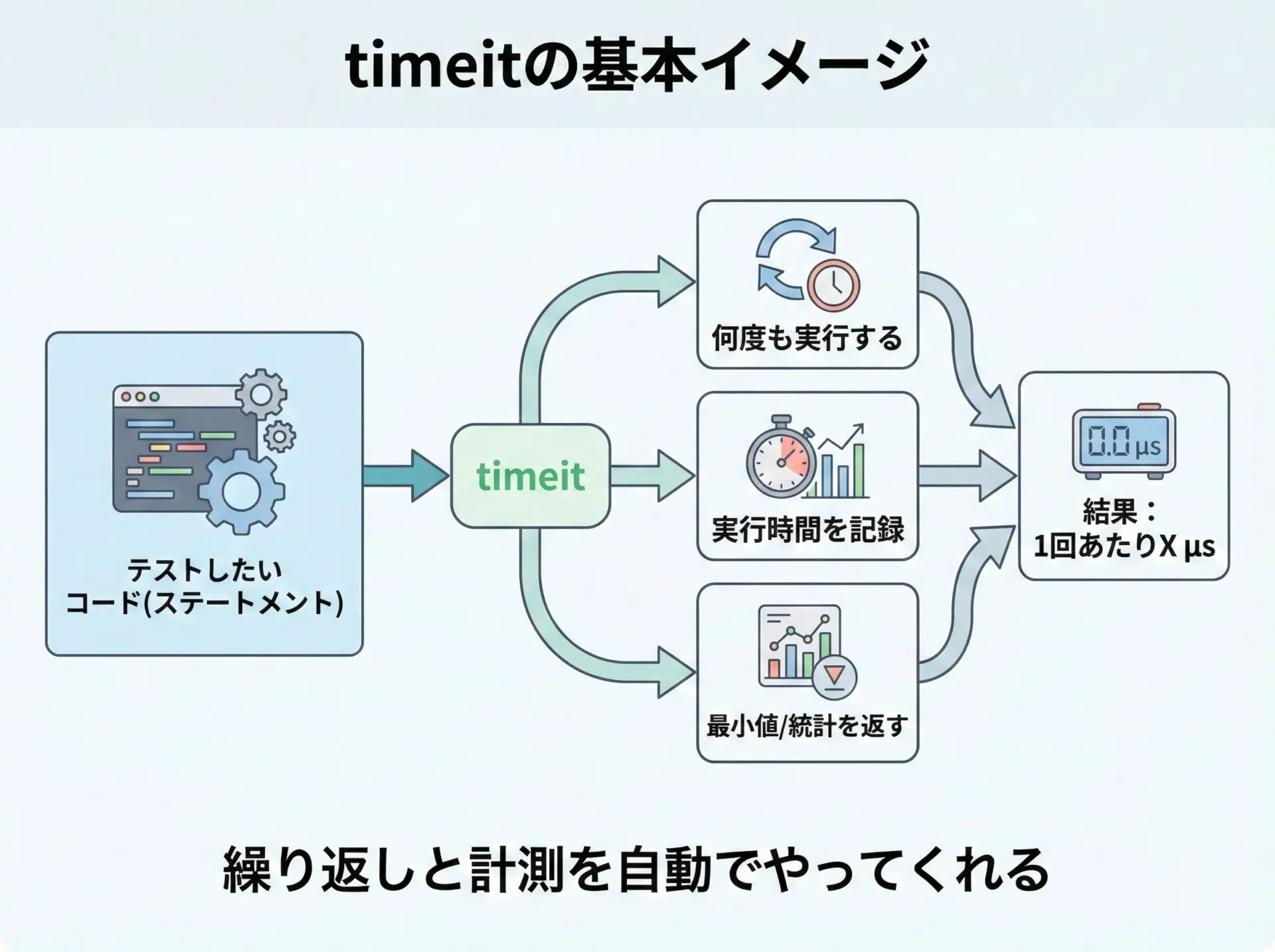 timeitはベンチマークに特化しているため、本番の処理経路に組み込むと余計な繰り返し実行が発生してしまい、用途に合いません。
