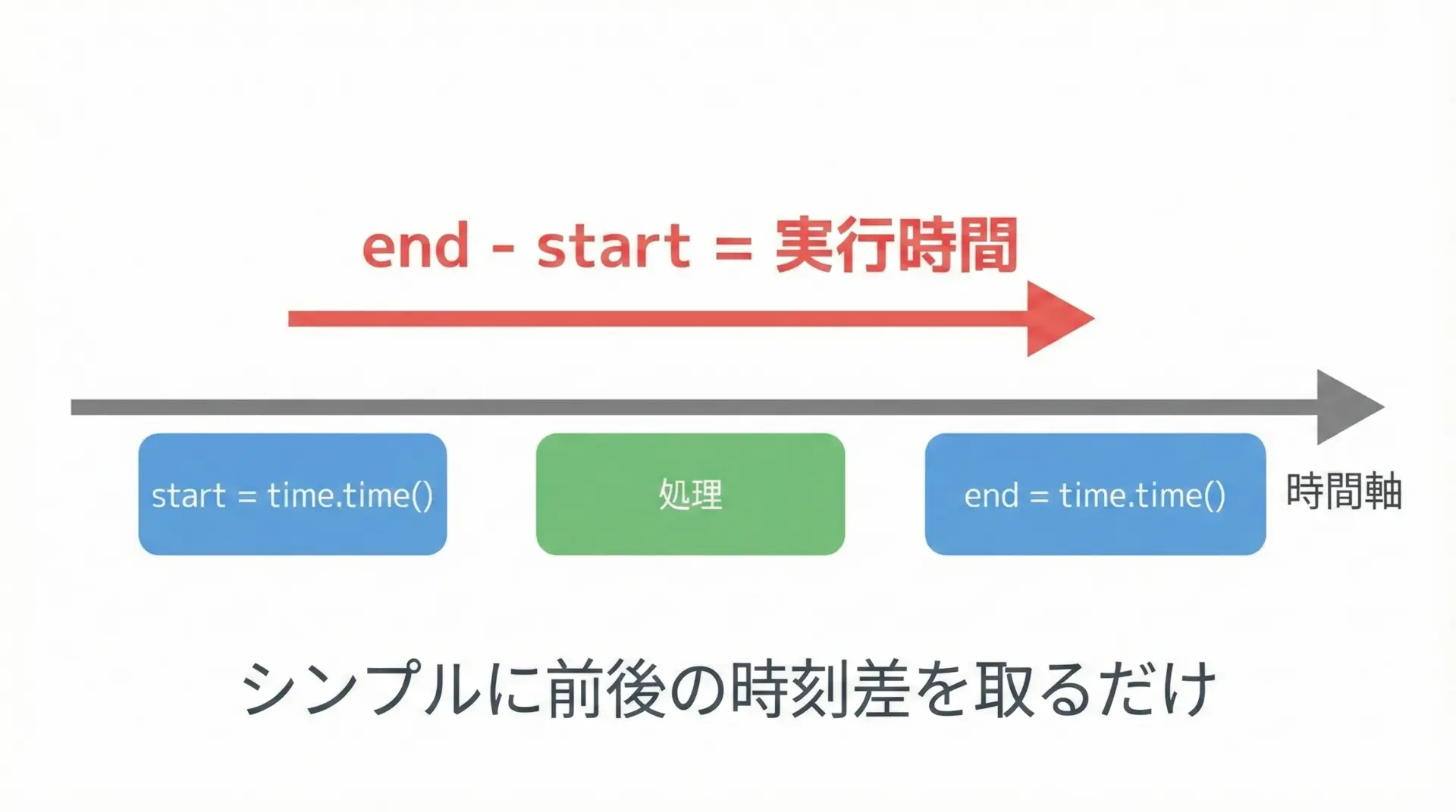 最も単純な計測方法は、処理の前後でtime.time()を呼び、その差を取る方法です。