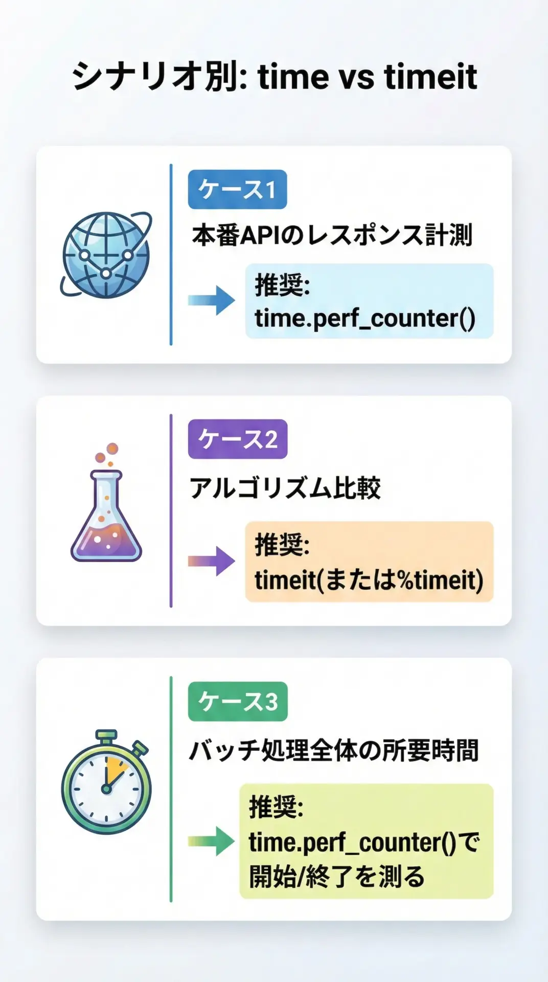 「まずtimeで全体の構造を掴み、その後timeitで細かい実装差を詰める」という使い分けが、現場では実用的です。