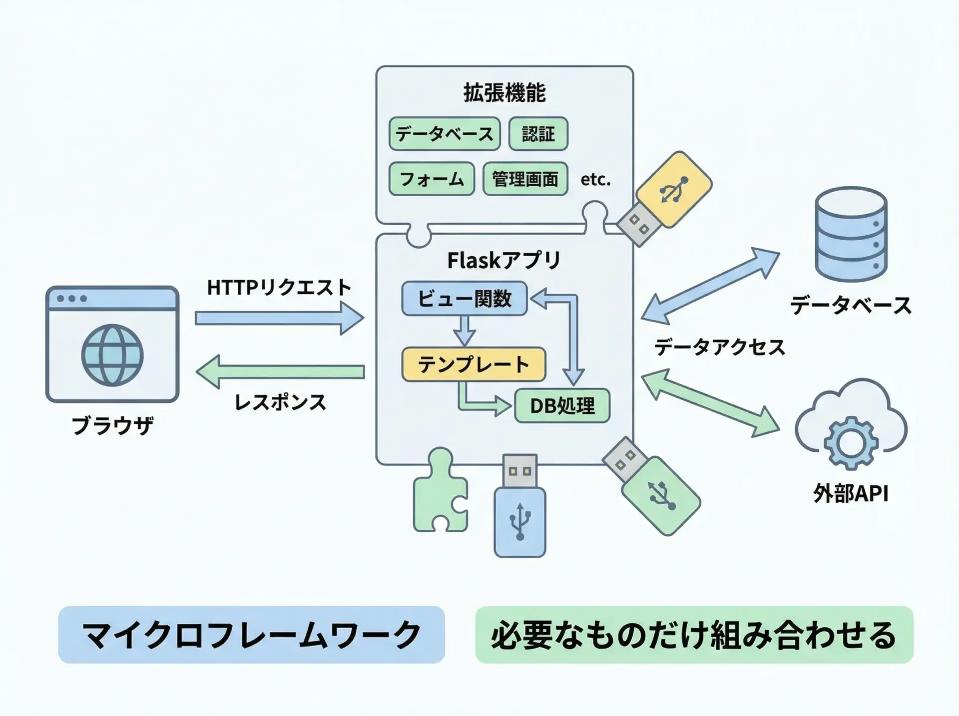 一方で、Flaskは極めて最小限の機能のみをコアに持ち、その他は拡張として組み合わせていくスタイルです。