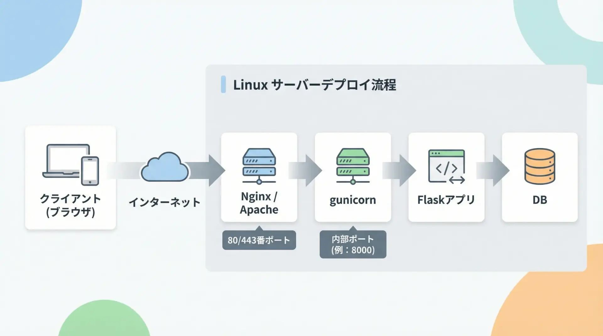 近年は、DockerコンテナにFlaskアプリをパッケージングし、任意の環境にデプロイする方法が主流になりつつあります。