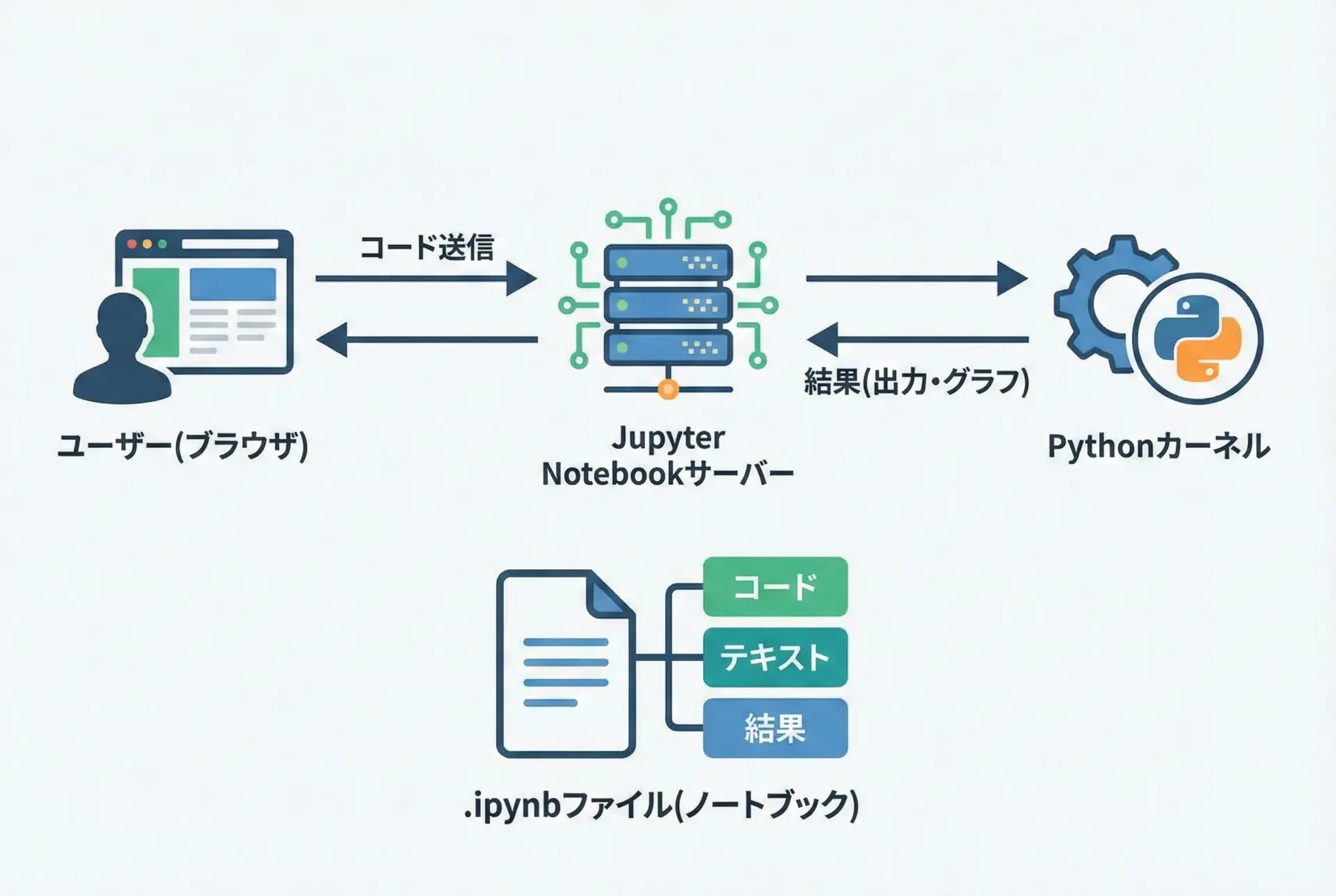 Jupyter Notebookは、次のような構造で動作しています。