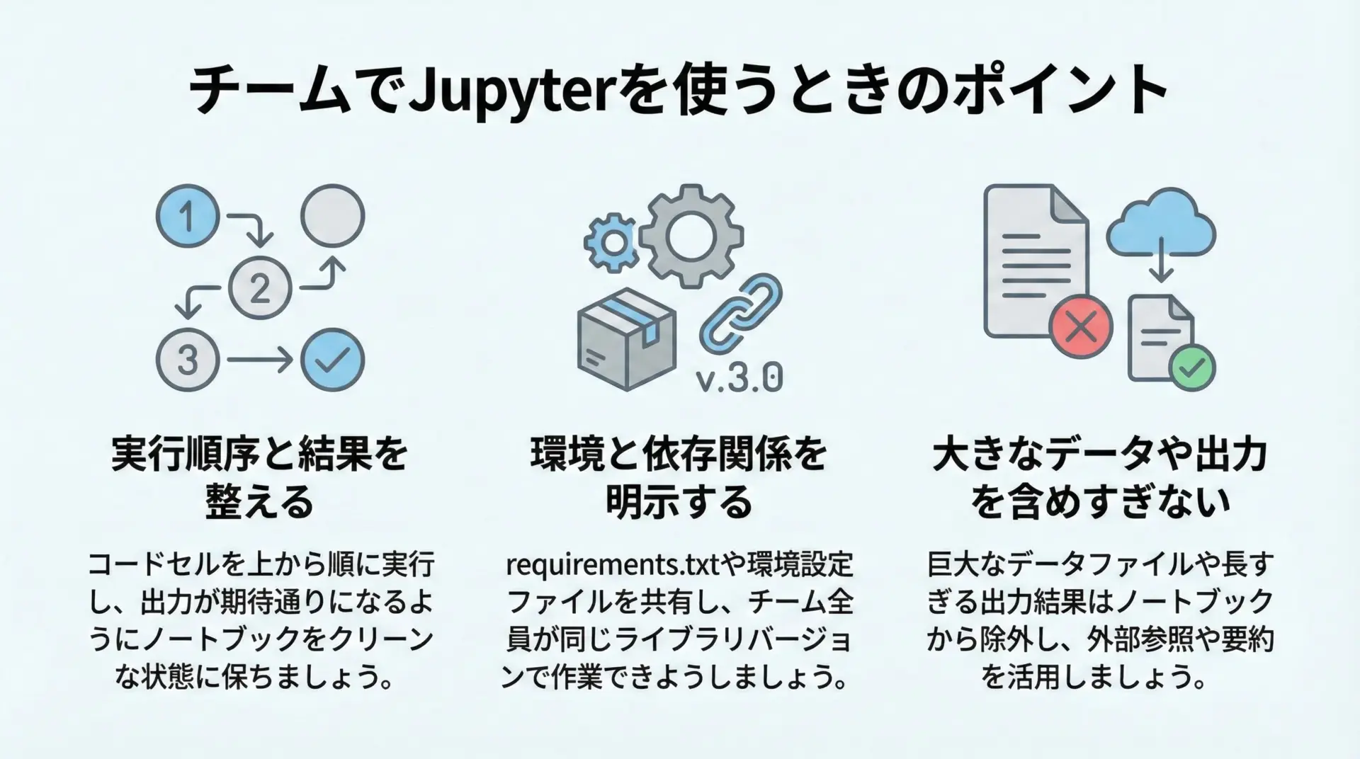 チームでのJupyter Notebook運用では、次の点に注意するとトラブルが減ります。