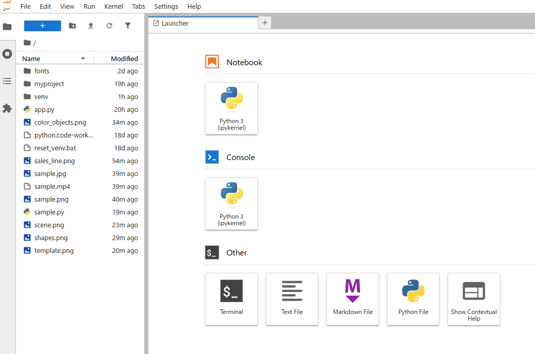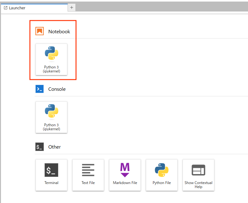 JupyterLabではランチャー(Launcher)からPythonアイコンを選ぶと新しいノートが開きます。