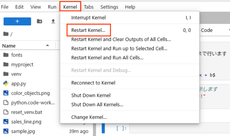 で登録します。 - リソース不足: 大きなデータで動かなくなったら、カーネルを再起動し、必要箇所だけ実行し直します。