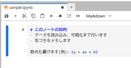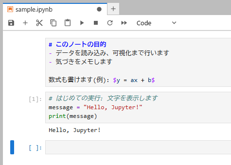Jupyterは「コードを少しずつ試し、結果を確認し、説明を書き足しながら分析を進められるノート型の開発環境」です。