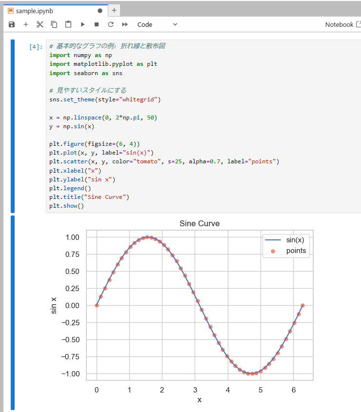 Jupyter Notebook/JupyterLabは、Pythonのコード、説明文、図表を1つのノートにまとめ、実行結果をすぐ確認しながら学べる対話型環境です。