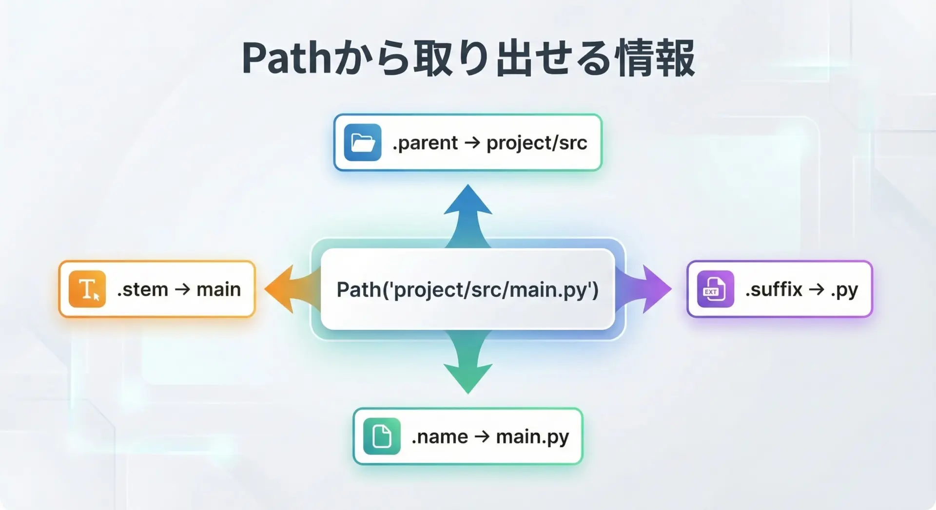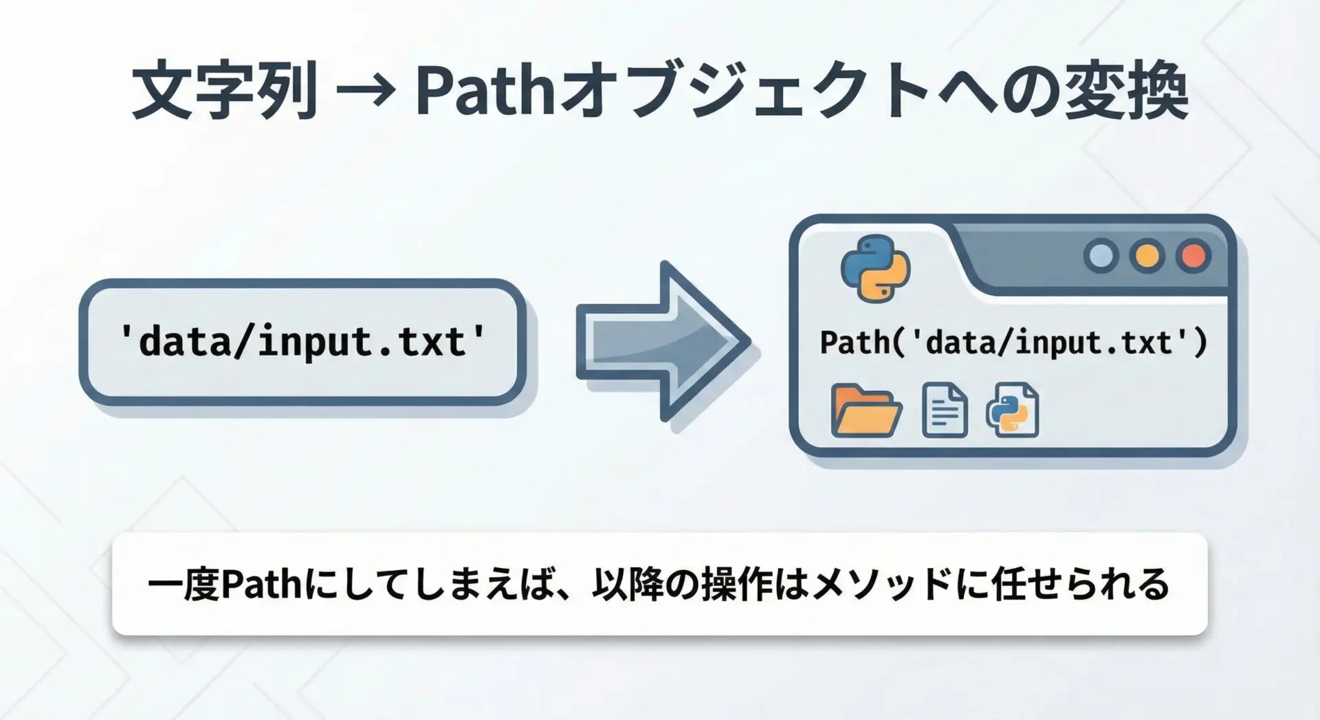 次に、パスが単なる文字列ではなく「Pathオブジェクト」になることで、直感的なメソッドが使える点も重要です。