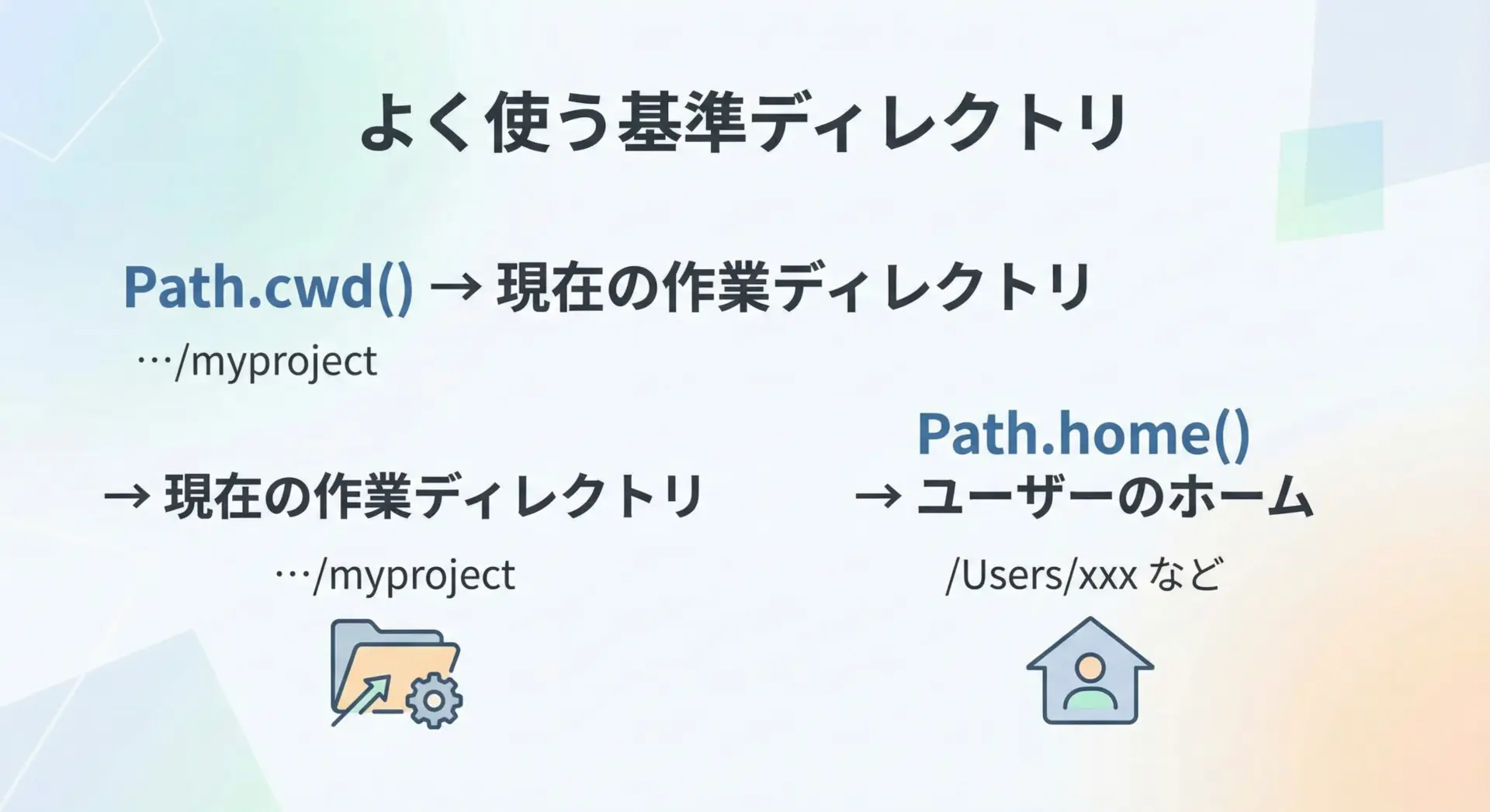 このように、パス文字列を直接操作せず、Pathオブジェクトに変換してから扱うことが、pathlibの基本スタイルです。