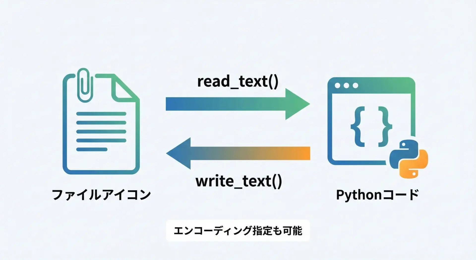 | 入出力 | テキスト読み書き | p.read_text()、p.write_text() |