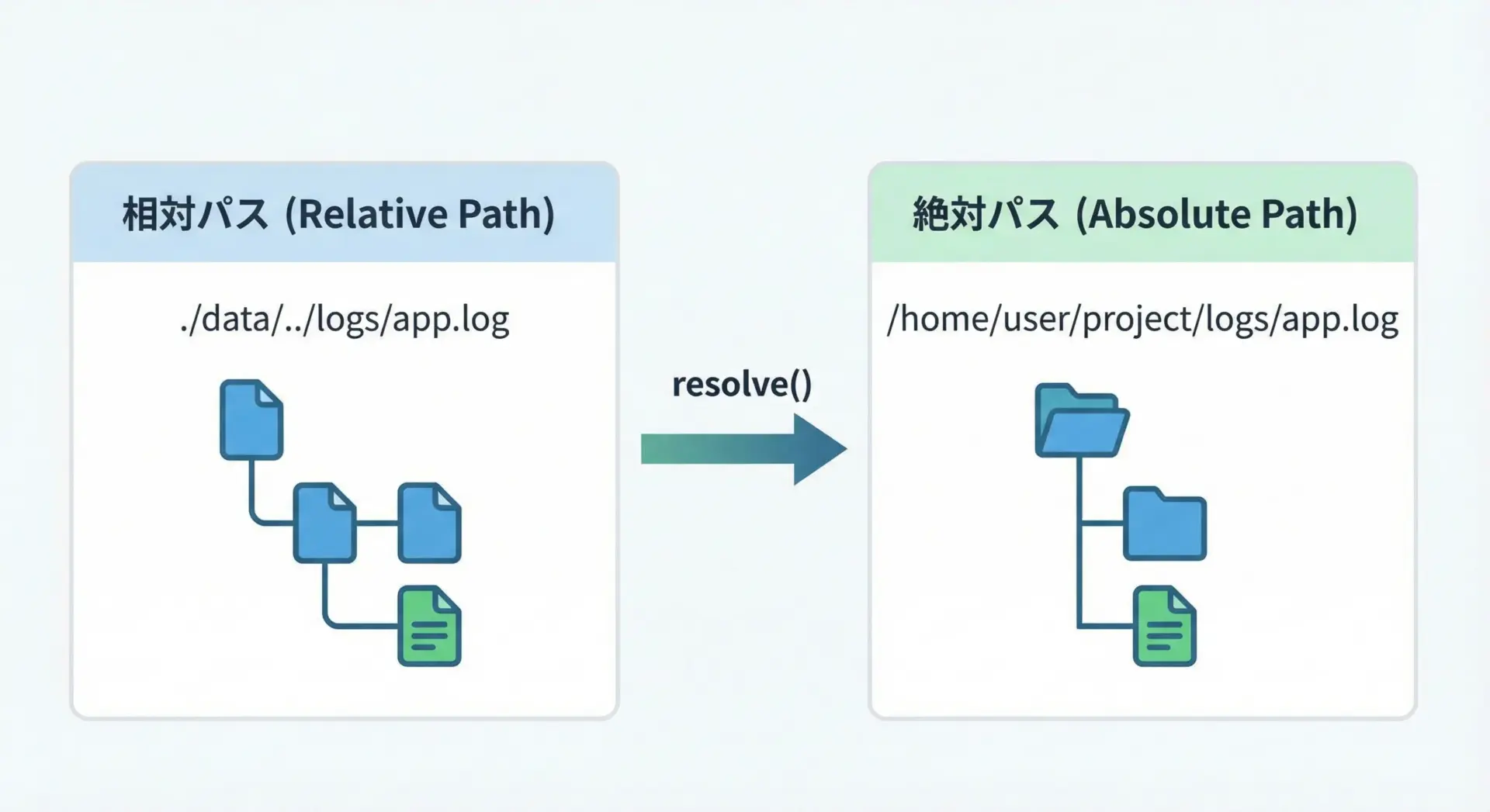 相対パスを絶対パスに変換したり、シンボリックリンクを解決して実体のパスを取得したい場合には、resolve()が役立ちます。