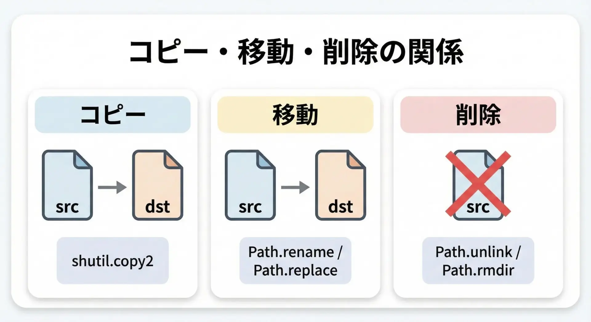 | 操作 | 削除 | p.unlink()、p.rmdir() |