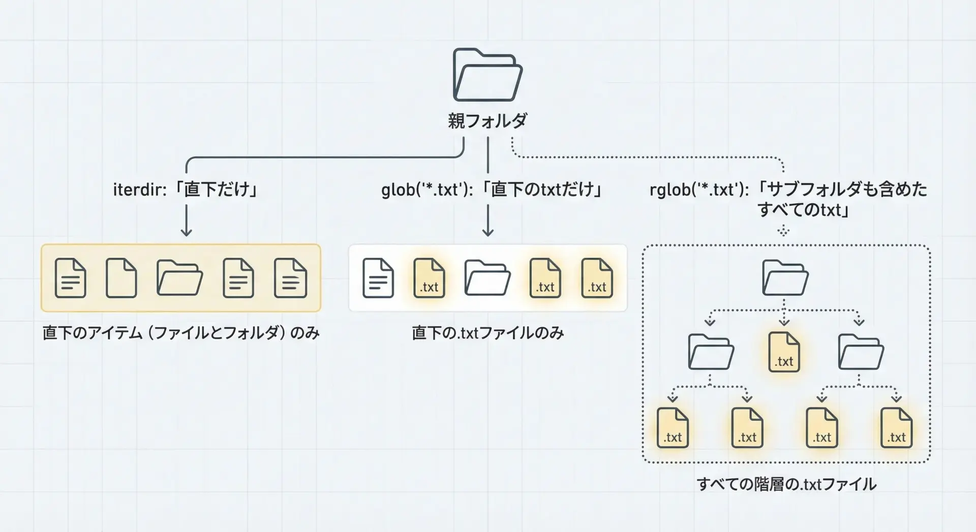 | 列挙 | パターンマッチ(glob) | p.glob(".txt")、p.rglob(".py") |