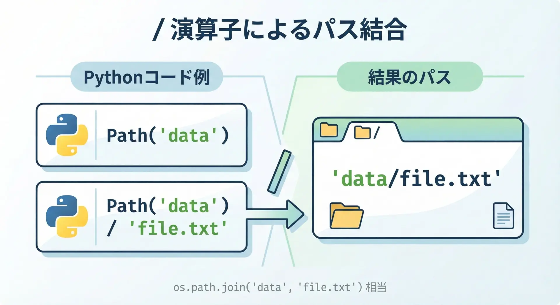 コード上ではPath("dir") / "file.txt"のように、演算子/でパス結合できるため、OS差異を意識せずに書けます。