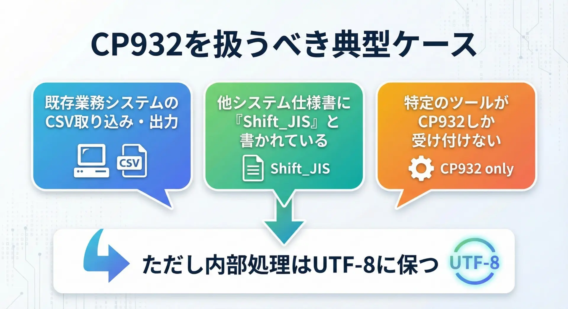 CP932(Shift_JIS系)は、Windows日本語環境で長く使われてきたため、今もなおCSVやログ、既存システムとの連携で避けて通れません。