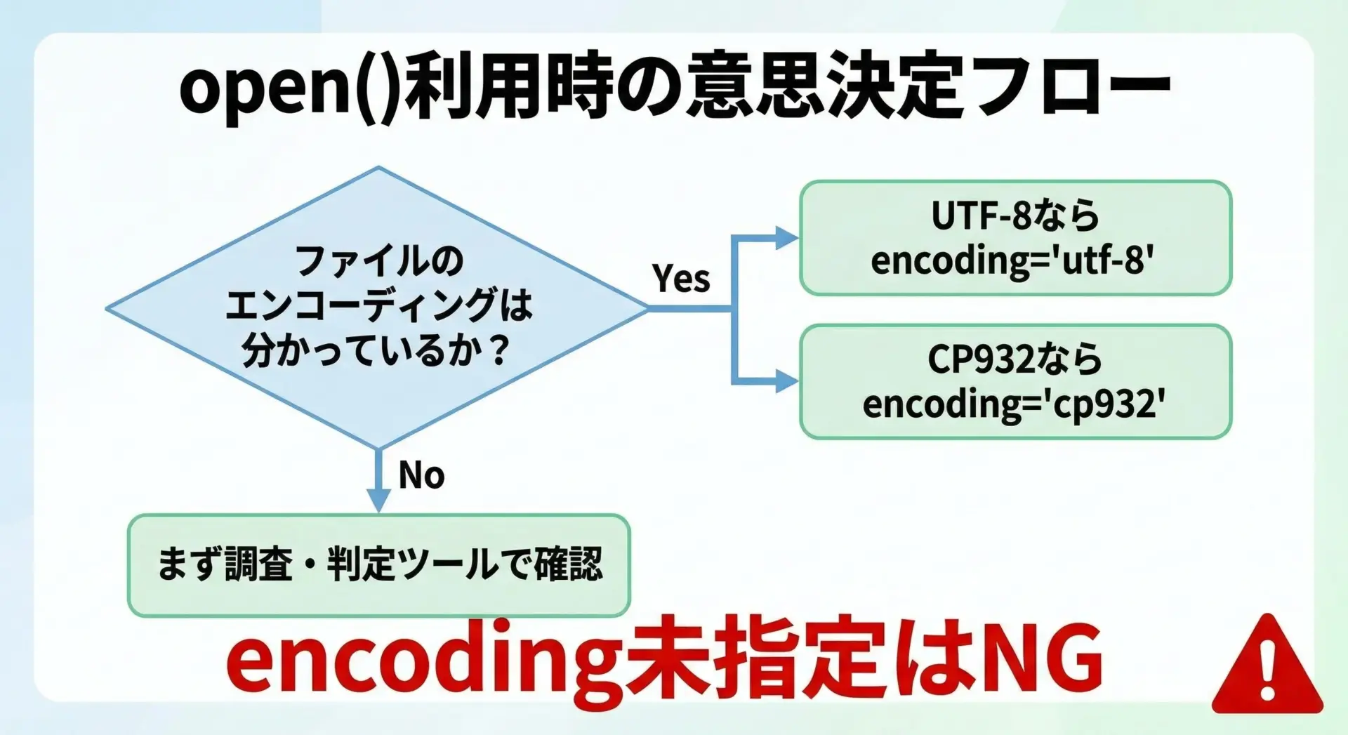 Pythonのopen()では、原則としてencodingを明示することが文字化け防止の最重要ポイントです。