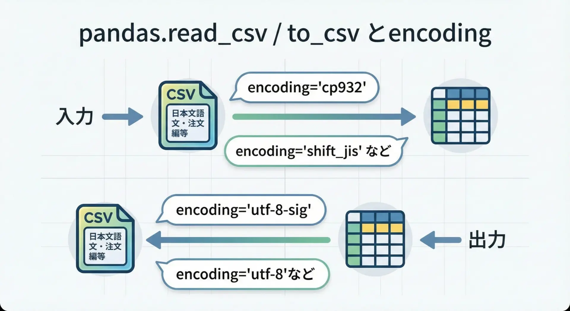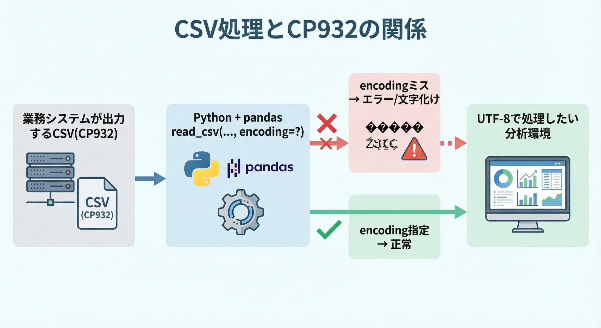 たとえば、業務システムがUTF-8前提で作られているのに、Python側でCP932を指定してCSVを作成してしまうと、読み込む側のシステムで文字化けが発生します。