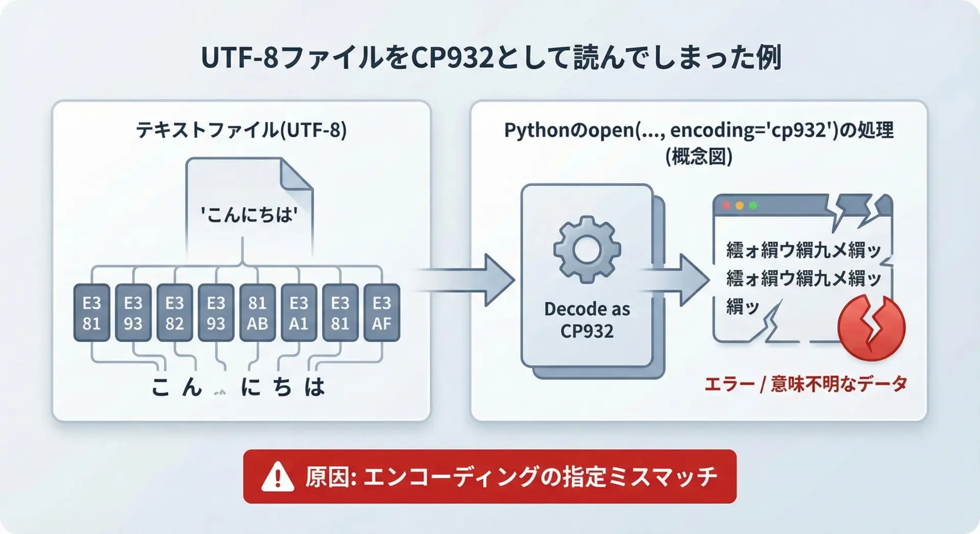 さらに、UTF-8とCP932は同じ日本語テキストでもバイト列が全く異なるため、「UTF-8のバイト列をCP932だと勘違いして読む」「その逆」といった状況で、いわゆる「文字化け」(読めない記号の羅列)が起きます。