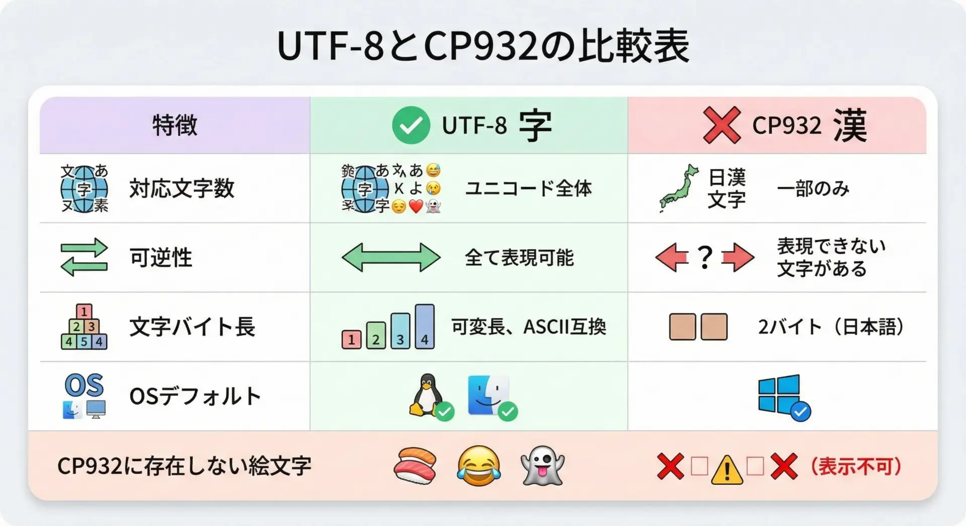 UTF-8とCP932の最大の違いは、「どこまでの文字を安全に扱えるか」と「環境間の互換性」です。
