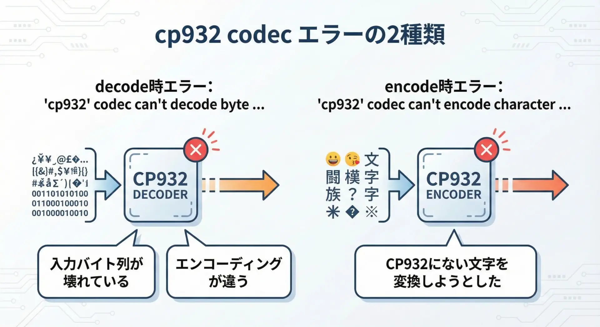 前者は、「CP932として解釈できないバイト列をCP932でデコードしようとした」ときに発生します。