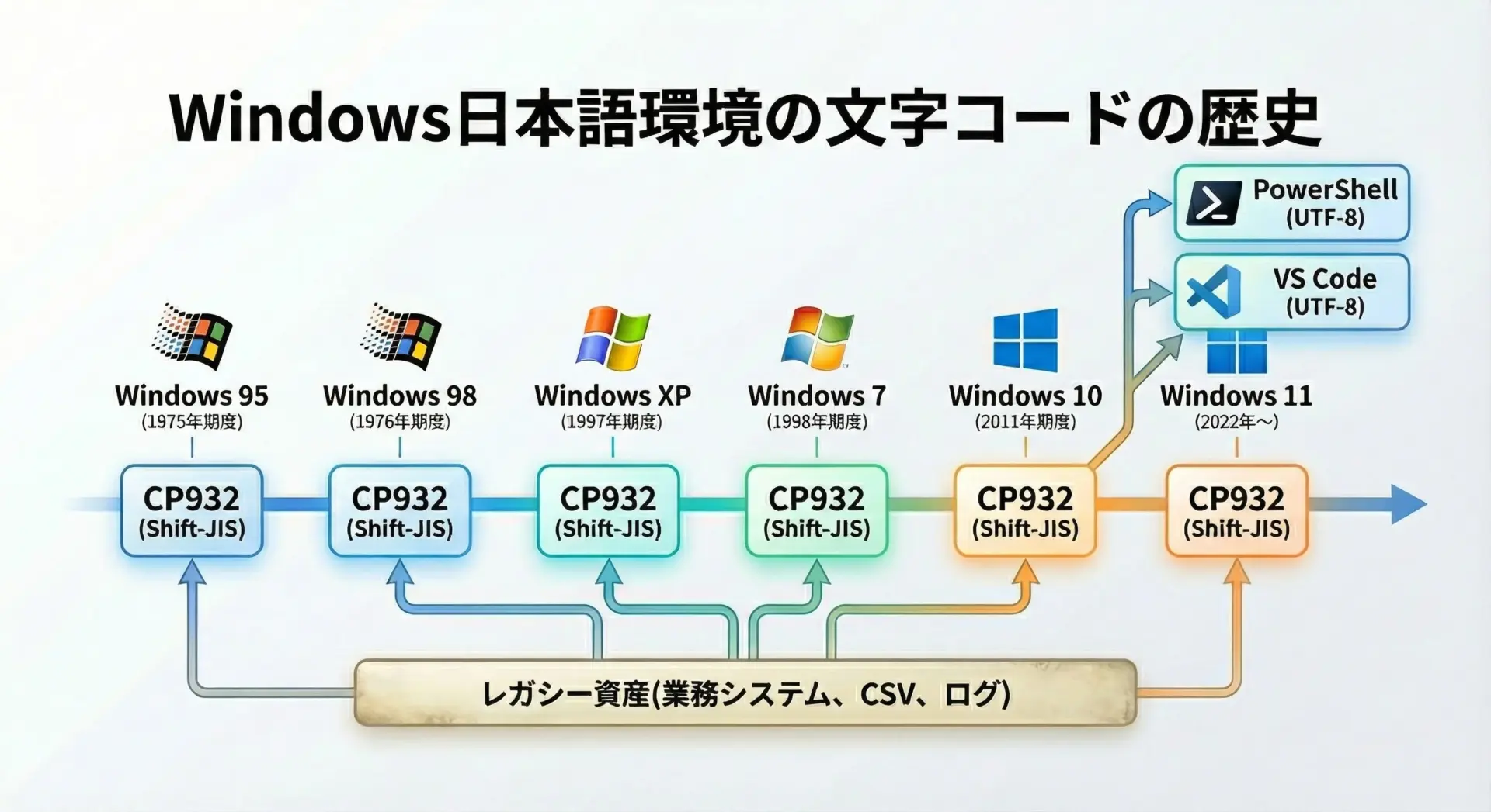最近はPowerShellやWindows Terminal、VS Codeなどを通じてUTF-8環境が広まりつつありますが、既存資産がCP932である以上、完全に無視することはできません。