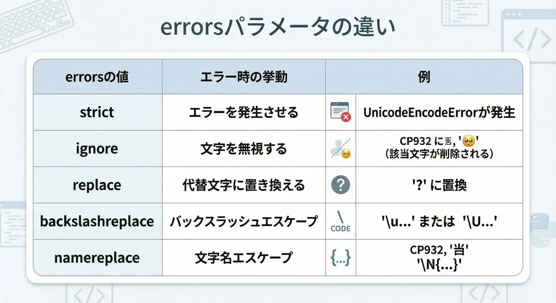 open()やstr.encode()、bytes.decode()にはerrorsパラメータがあり、エンコード/デコードエラー発生時の挙動を制御できます。