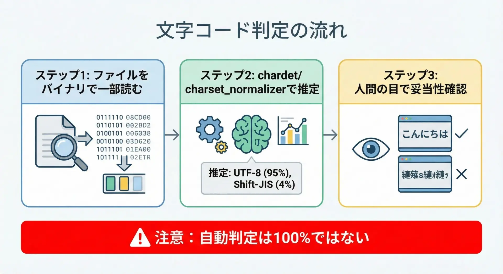 ただし、自動判定は完全ではないため、実際にそのエンコーディングで開いて日本語が正しく読めるかを確認することが重要です。