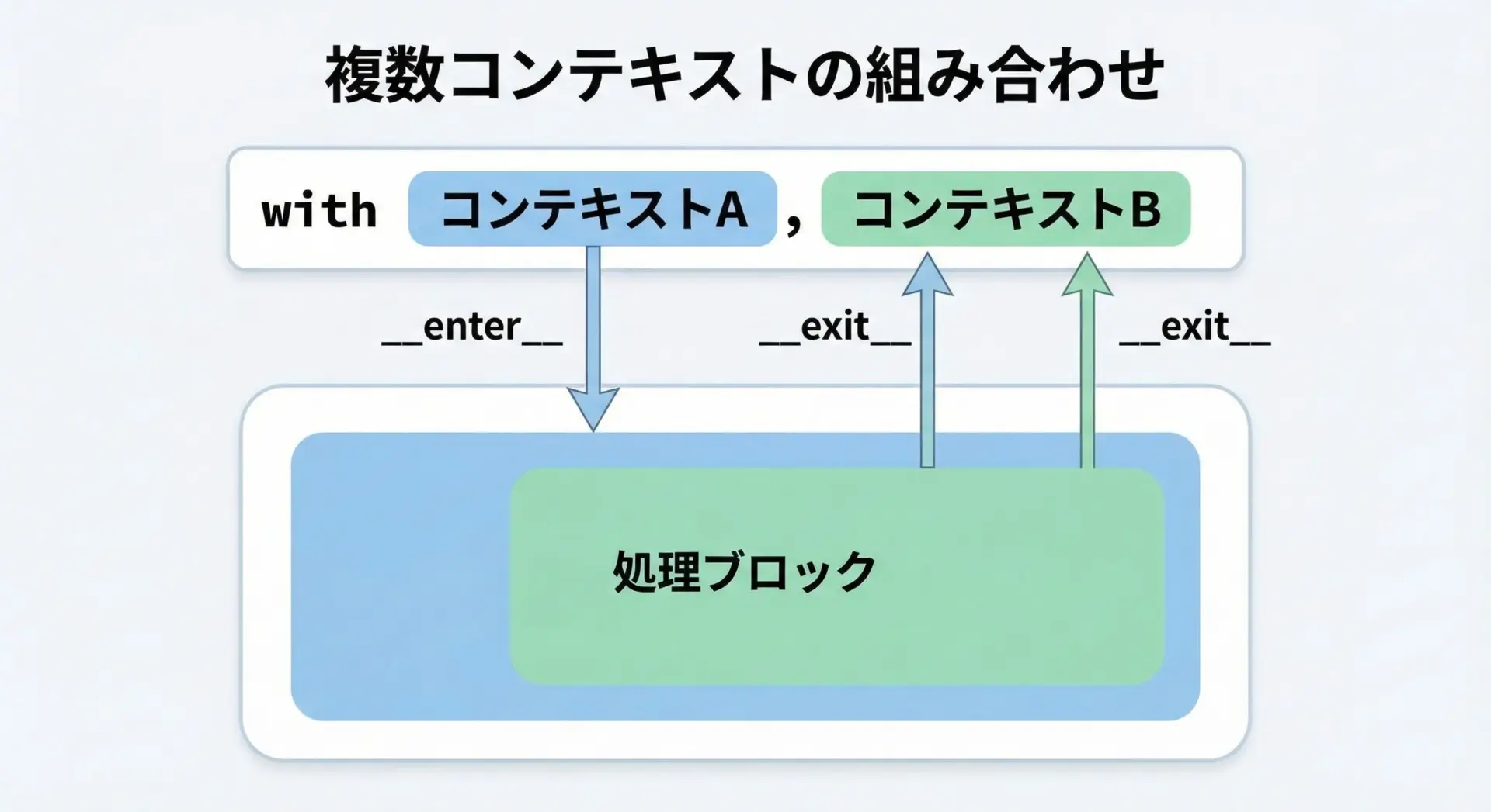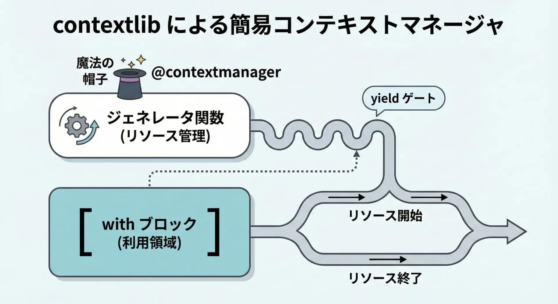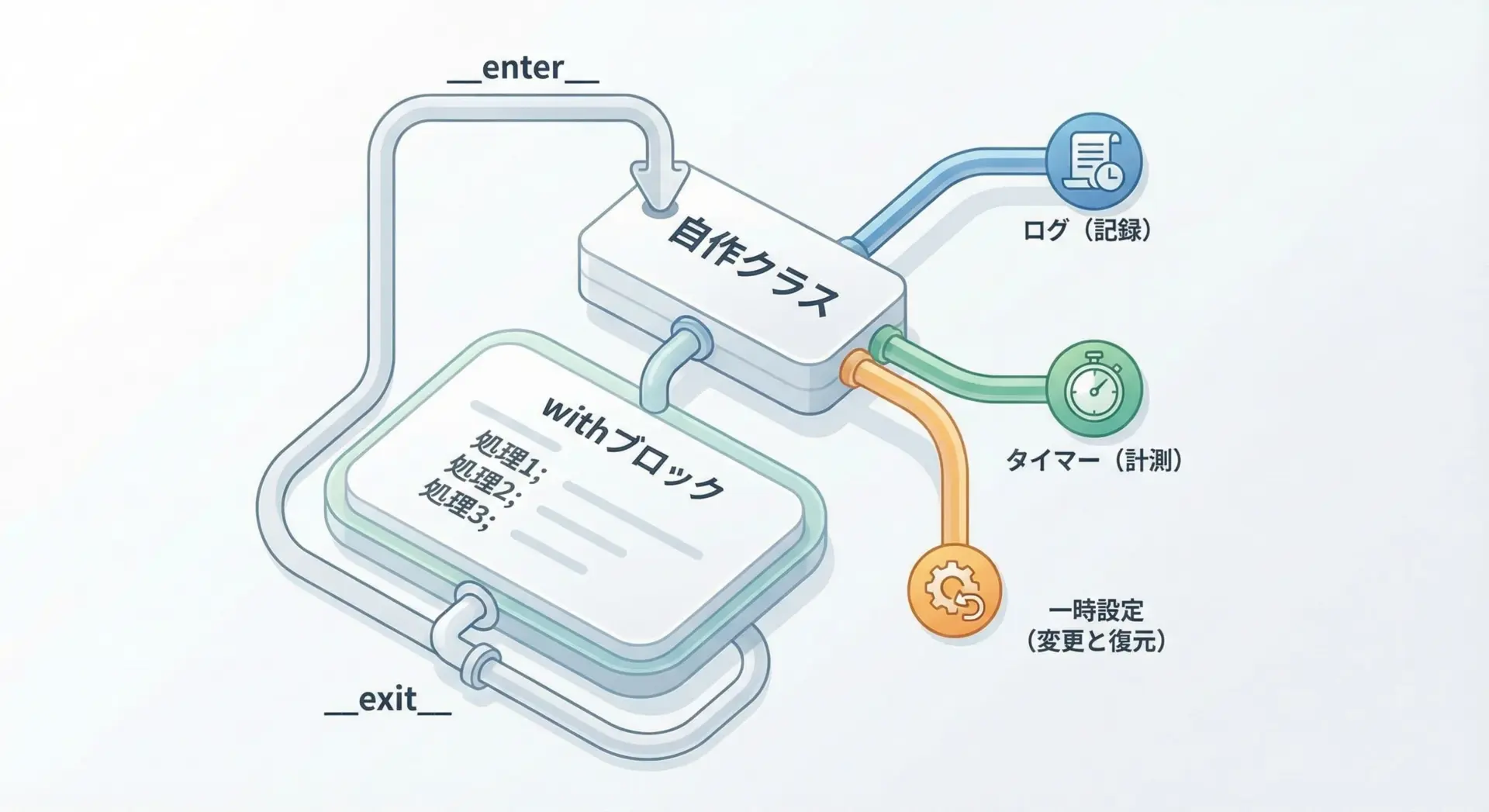 また、自作クラスやcontextlibを用いて独自のコンテキストマネージャを設計することで、再利用性の高い「前後処理のパターン」を構築できます。