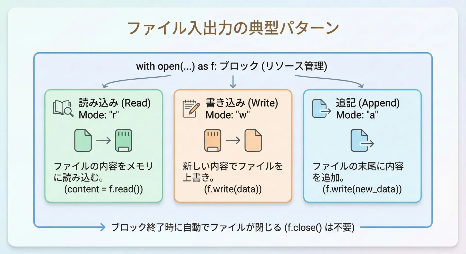 ファイルを開いたら必ず閉じる必要があるため、読み書きするたびにwith open(...)を使うのが現在の定石になっています。