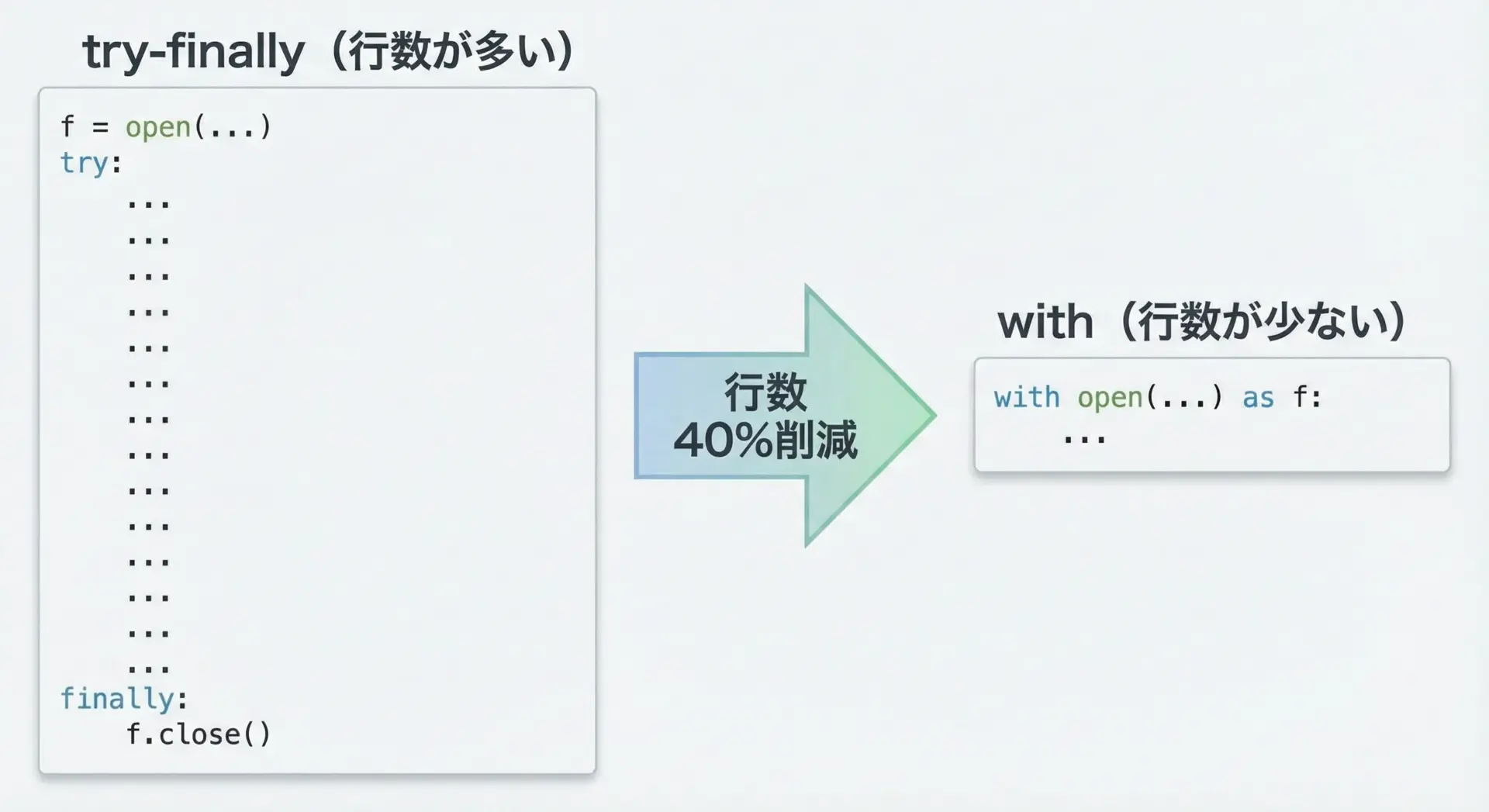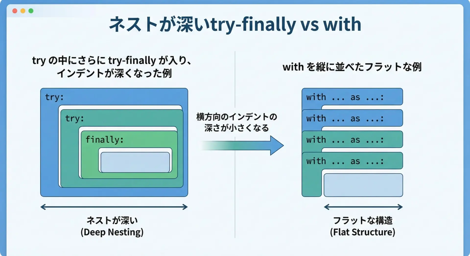 このように、ネストが深いtry-finally構造を、読みやすいwith構文に置き換えられるのは、長期運用されるコードベースにおいて特に重要なメリットです。