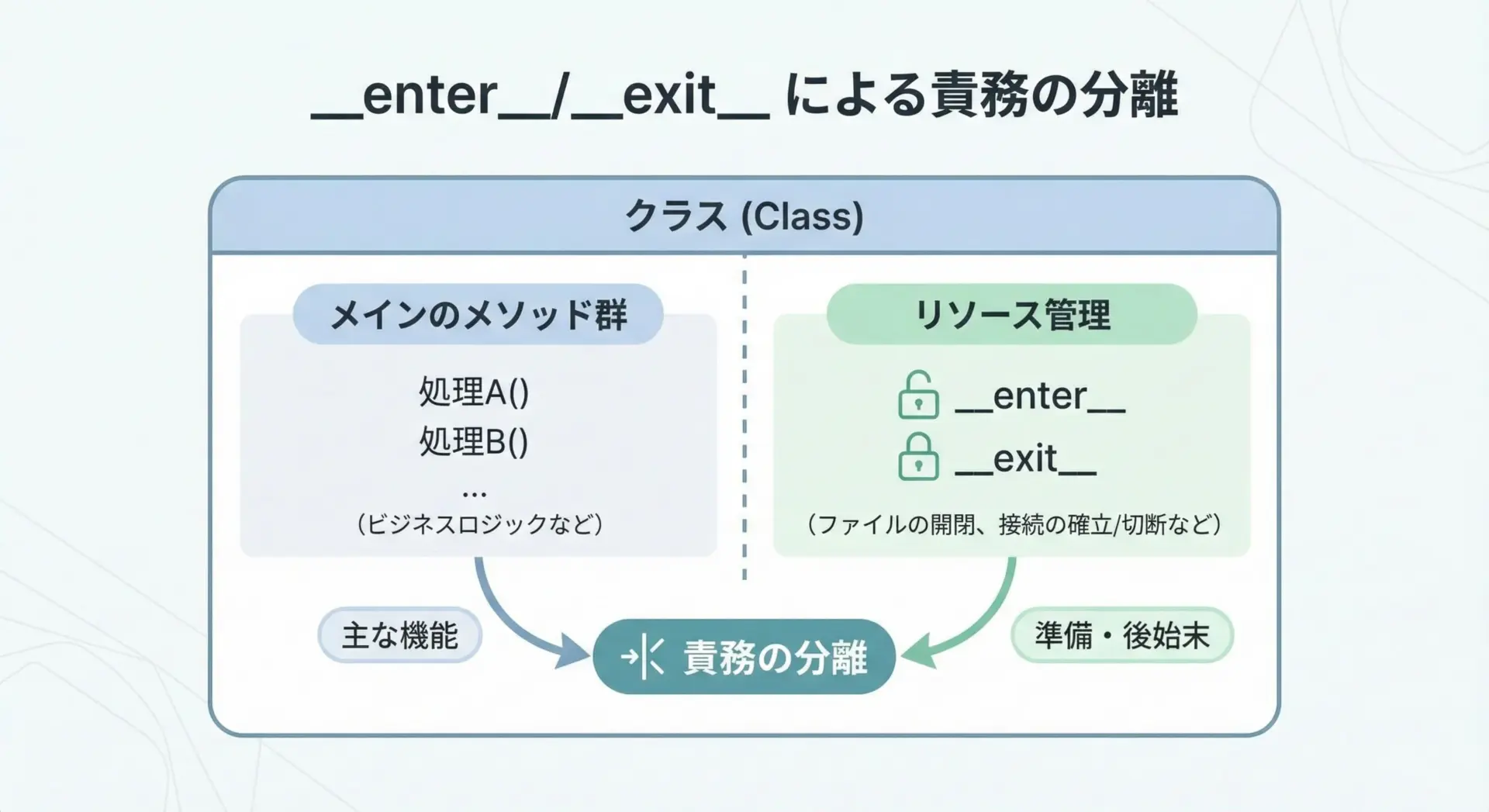 クラスにwith構文を実装する場合、リソースの確保と解放を__enter__と__exit__に集約することで、他のメソッドからclose処理を追いかける必要がなくなります。