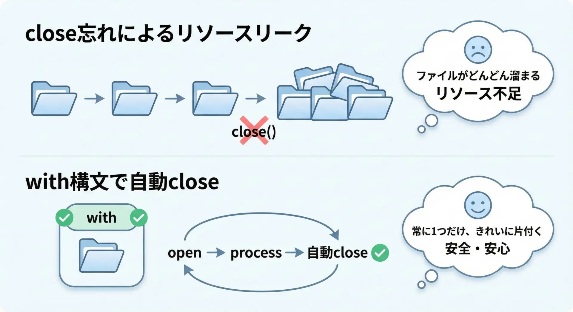close忘れが積み重なると、「ファイルをこれ以上開けません」などのエラーや、メモリ使用量の増加につながります。