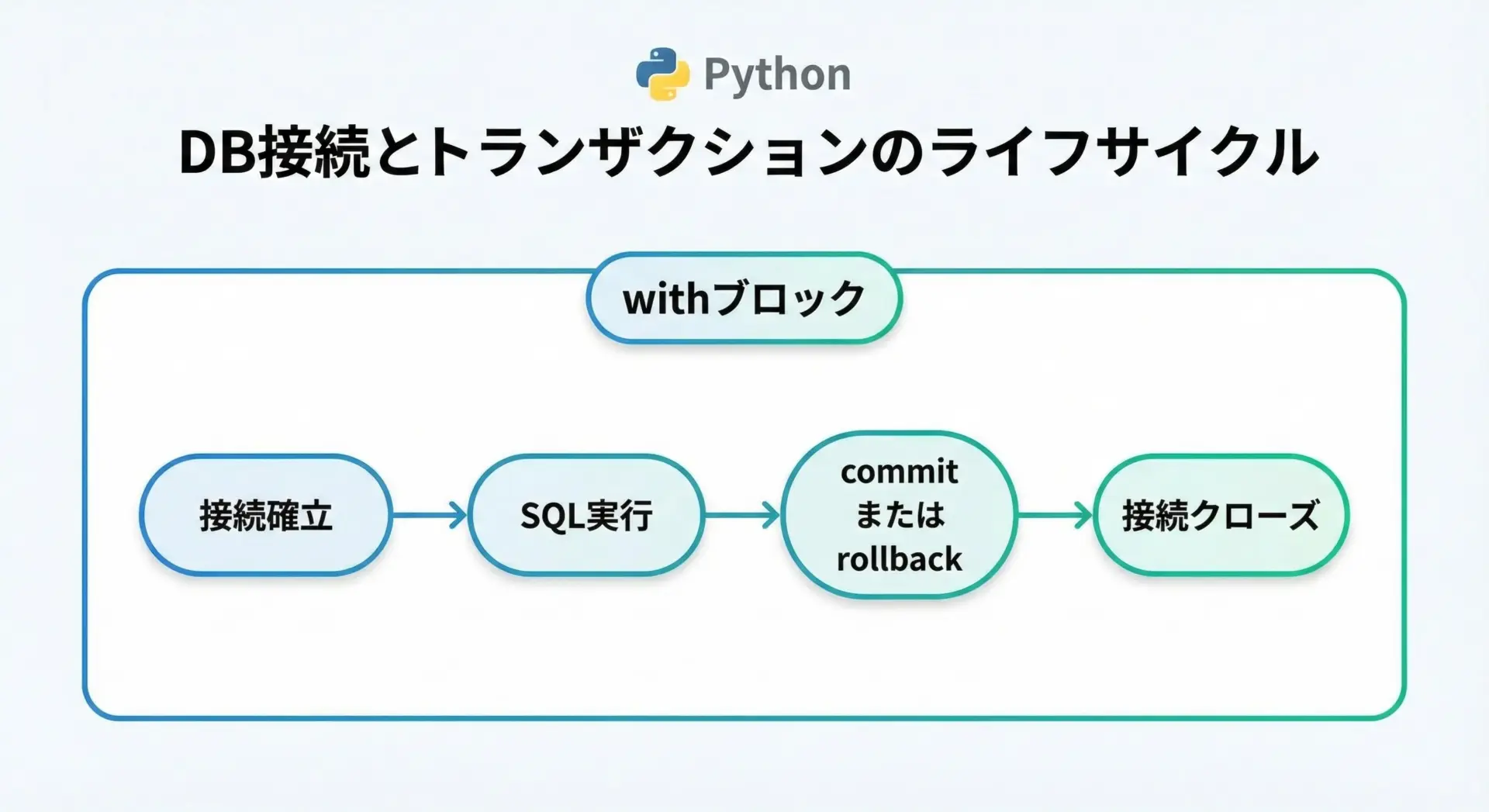 接続を開きっぱなしにしたり、トランザクションのcommit/rollbackを忘れると重大な不具合になりますが、with構文で管理すると明確になります。