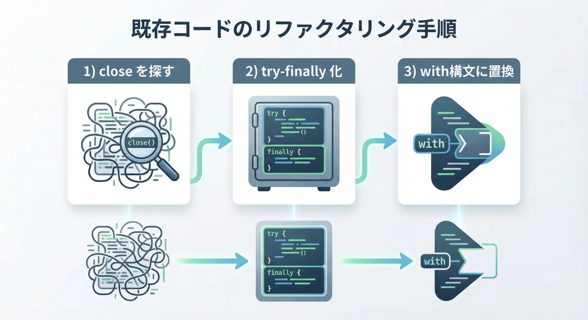 次に、それらのコードを一旦try/finallyで安全な形に直し、その後でwith構文に置き換えると、挙動を変えずにリファクタリングしやすくなります。