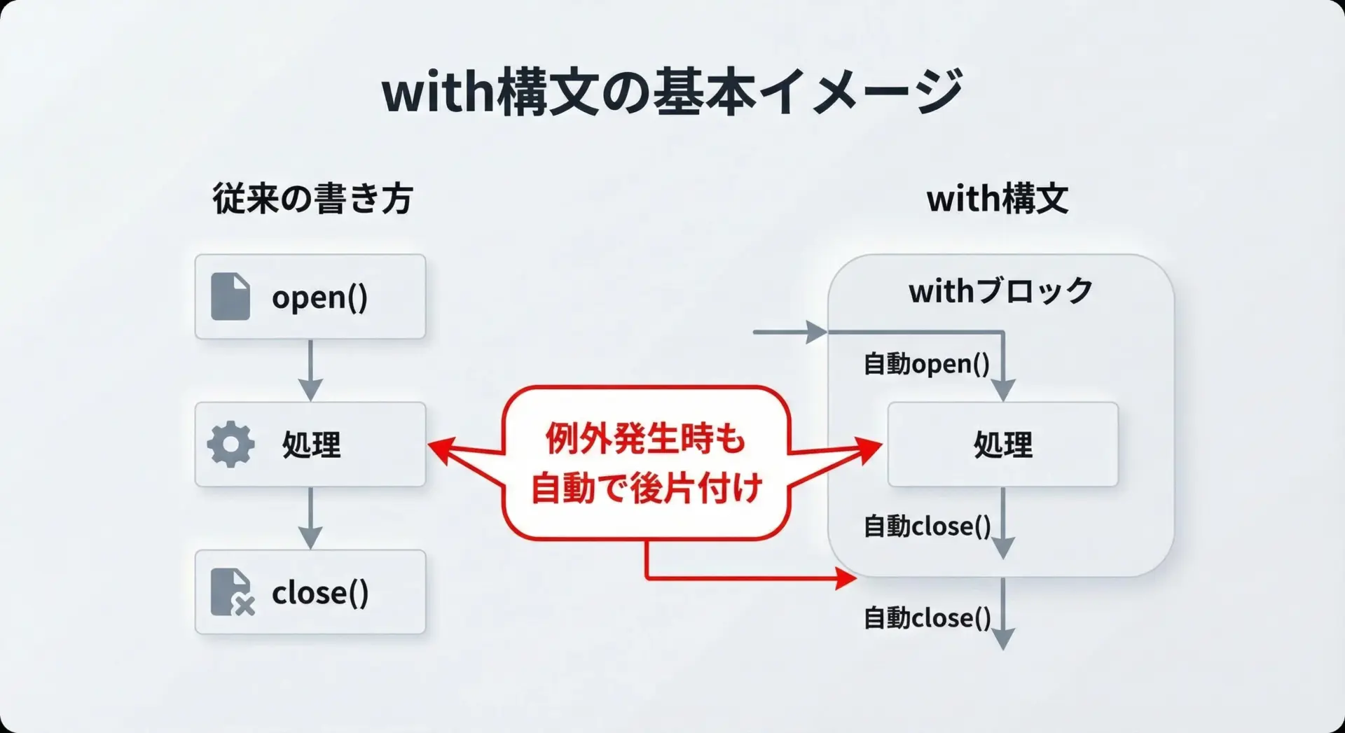 Pythonのwith構文は、ファイルやデータベース接続などの「開いたら必ず閉じるべきもの」を、自動で安全に片付けてくれる仕組みです。