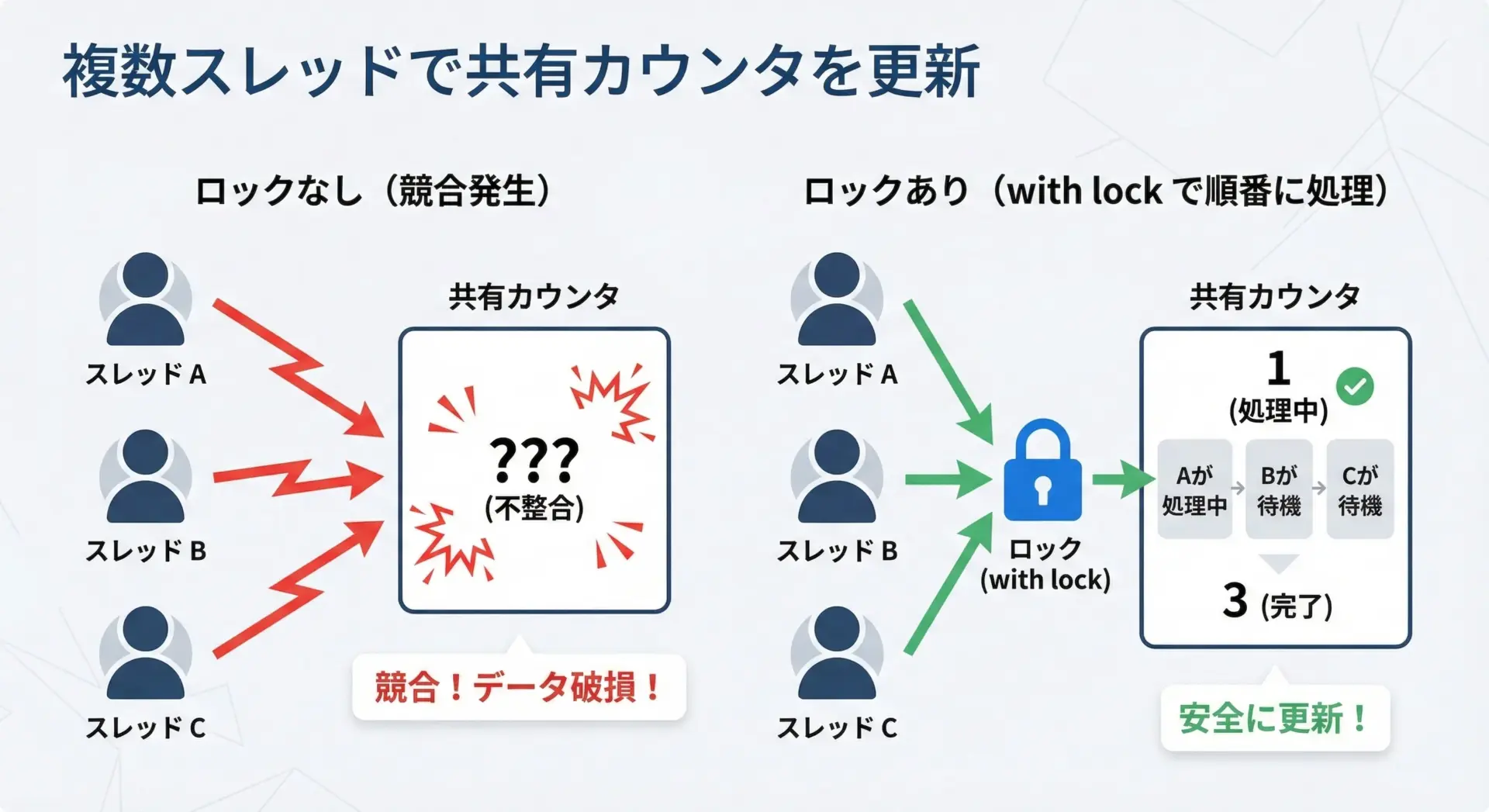 with構文でロックの取得と解放を確実に行うことが、並行処理の正しさを支える基盤になります。
