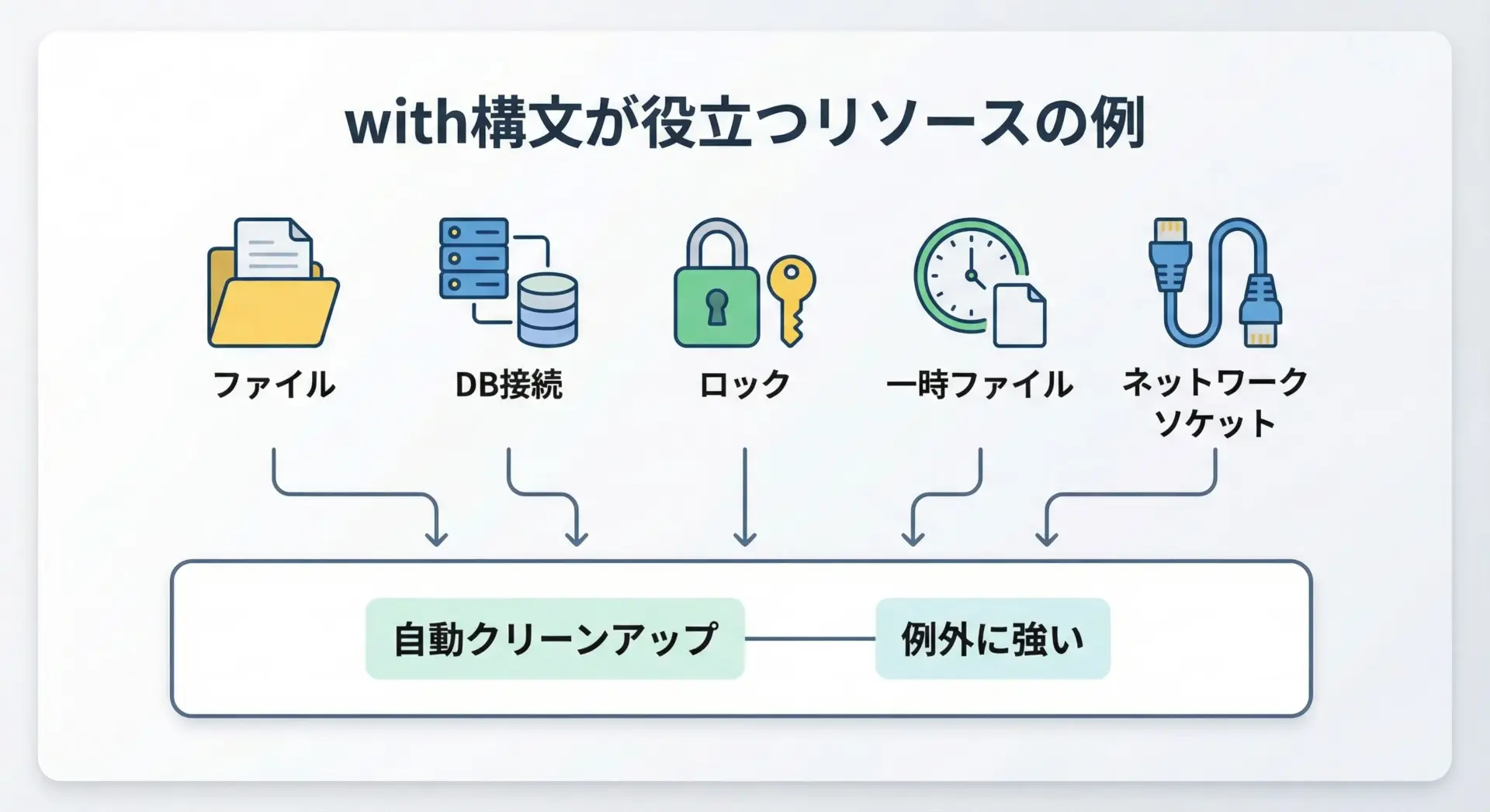ファイル操作やデータベース接続、ロック管理、一時ファイル、テストのセットアップなど、さまざまな場面で活躍し、close忘れやバグを大幅に減らしてくれます。