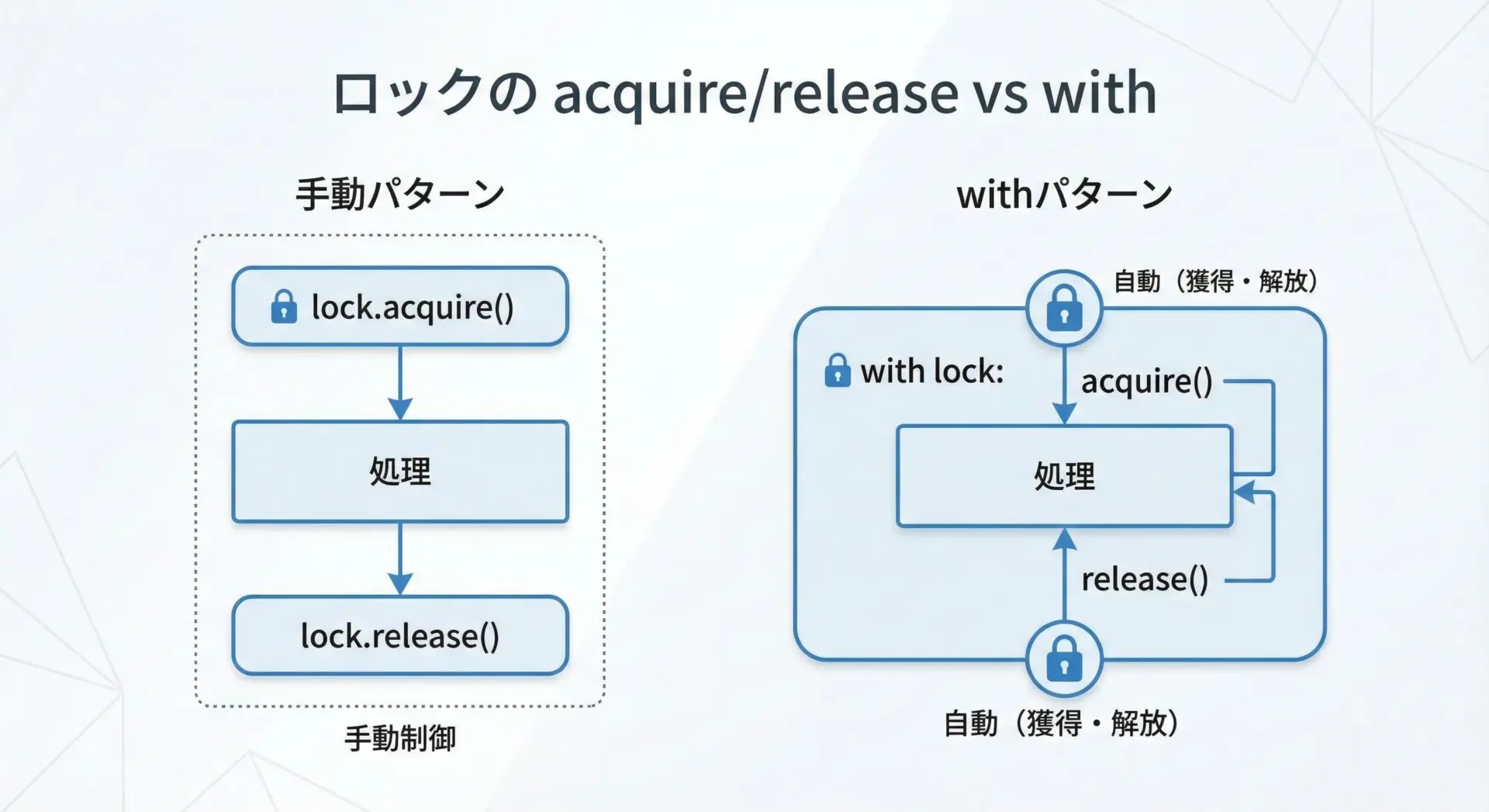 threading.LockやRLockなどはacquireとreleaseを正しく対にする必要がありますが、with構文ならロックの取り忘れや解放忘れを防げるので、安全性が大きく向上します。