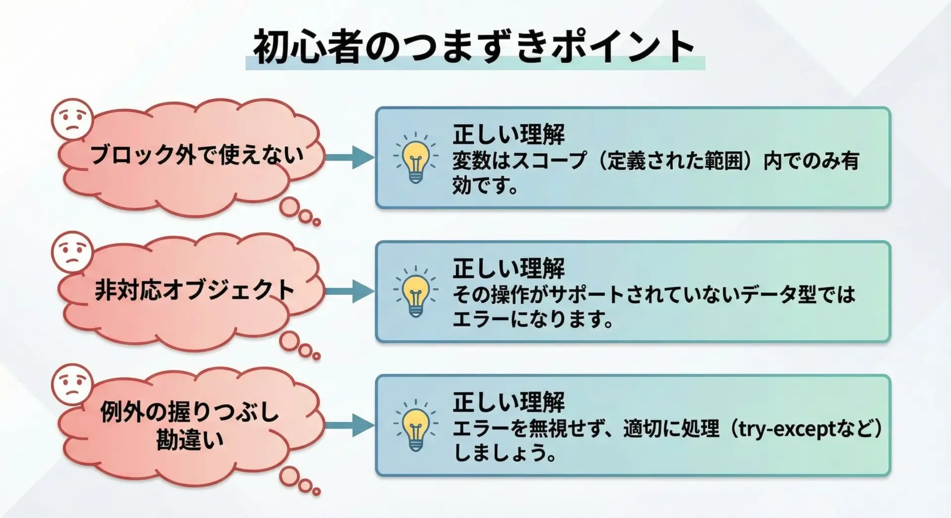 最後に、Python初心者がwith構文でよくつまずくポイントと、その対策を整理します。