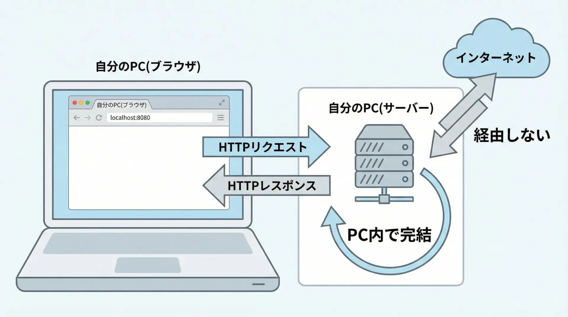 ブラウザからhttp://localhost:8000などにアクセスすると、実際にはインターネット上のどこかではなく、自分のPC上で動いているサーバープログラムと通信しています。
