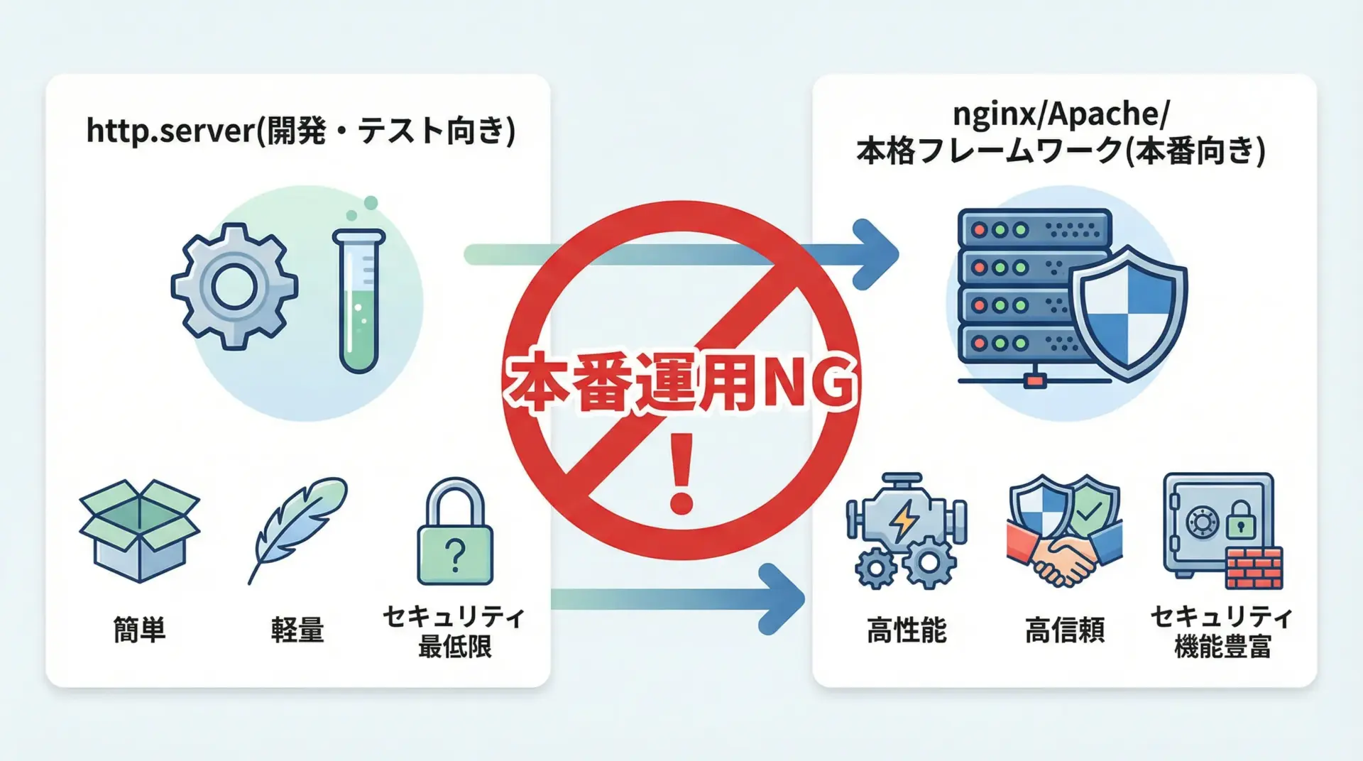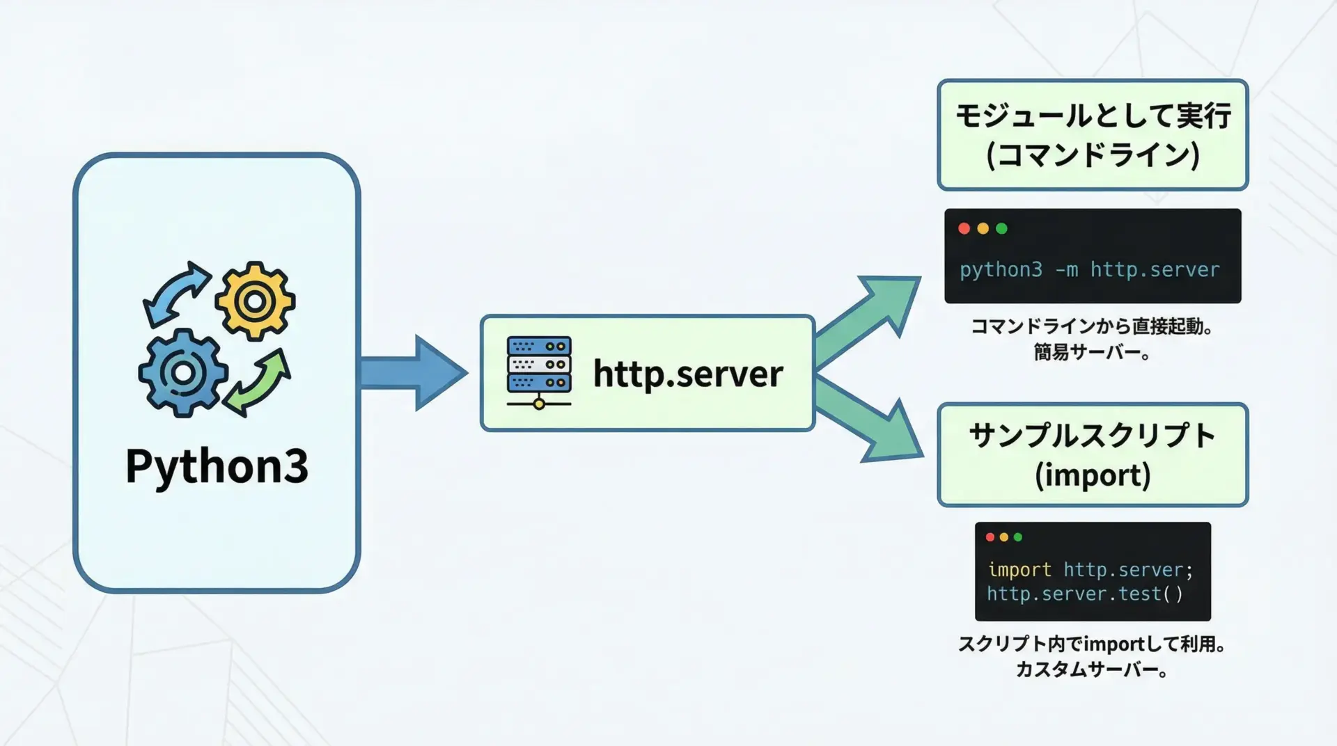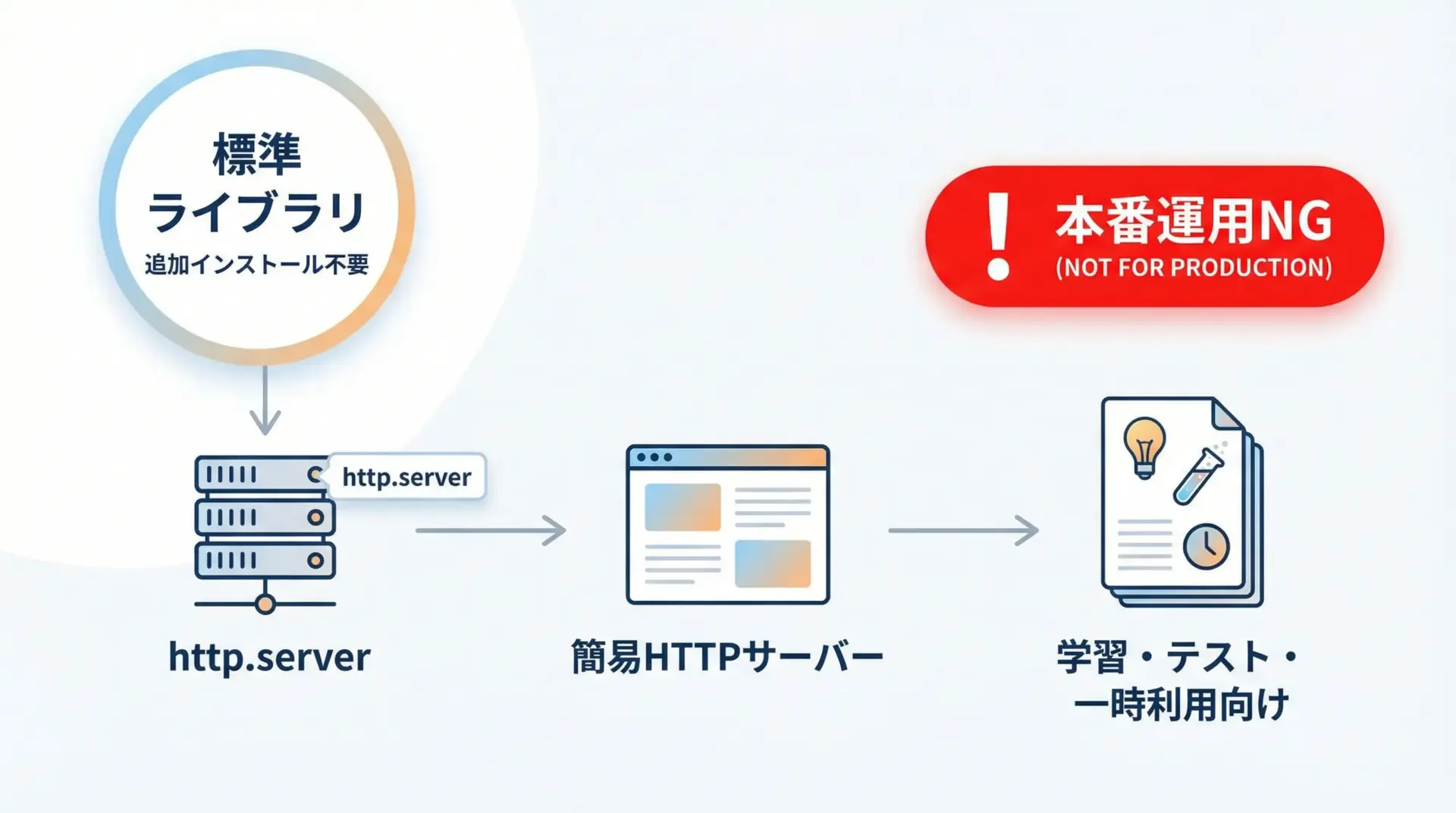 そのため、http.serverは開発・学習・一時的な利用専用のツールと位置づけ、本番用途では専用サーバーやWebフレームワークを使うことが重要です。