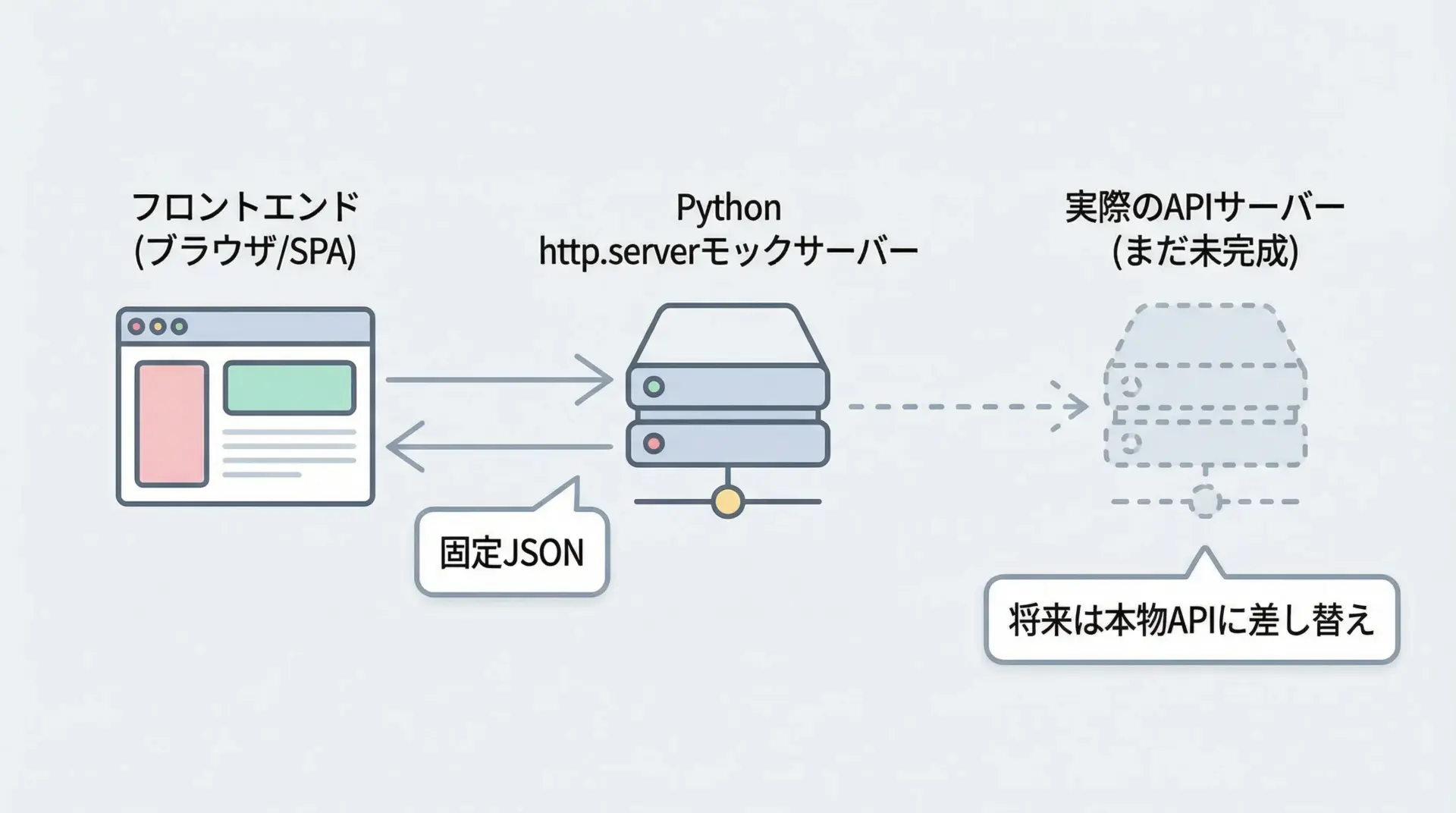 バックエンドがまだ出来上がっていない段階でも、簡易的なレスポンスを返すサーバーをPythonで用意して、フロントエンドの開発やテストを進めることができます。