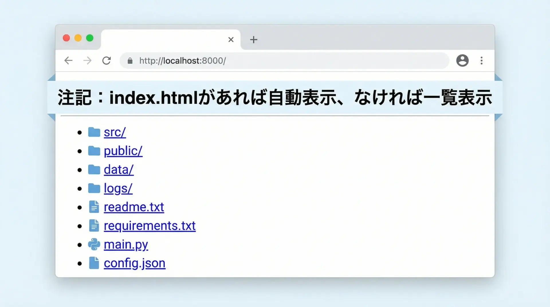 ブラウザでhttp://localhost:8000にアクセスし、フォルダ一覧やHTMLファイルなどが見られれば成功です。