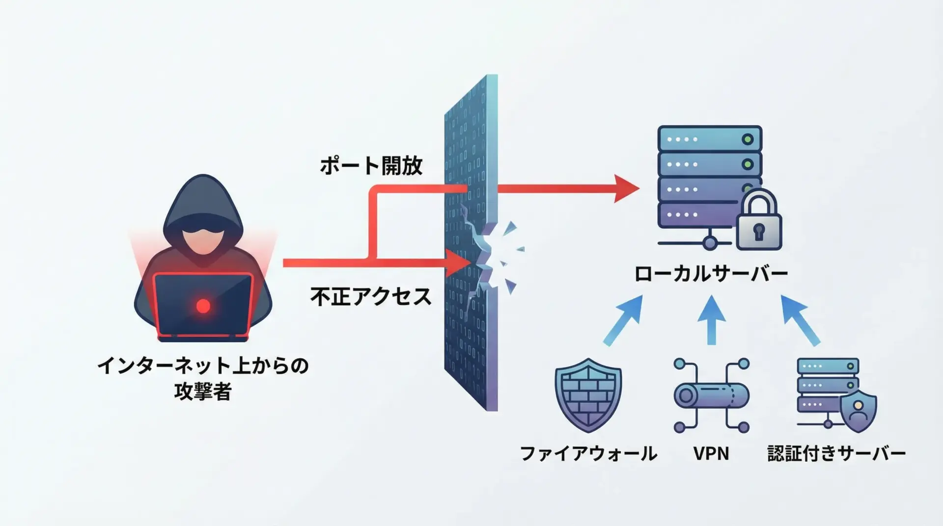 ルーターのポートフォワーディング設定や、クラウド環境のセキュリティグループ設定などが緩いと、世界中からあなたのローカルサーバーにアクセスできてしまう可能性があります。
