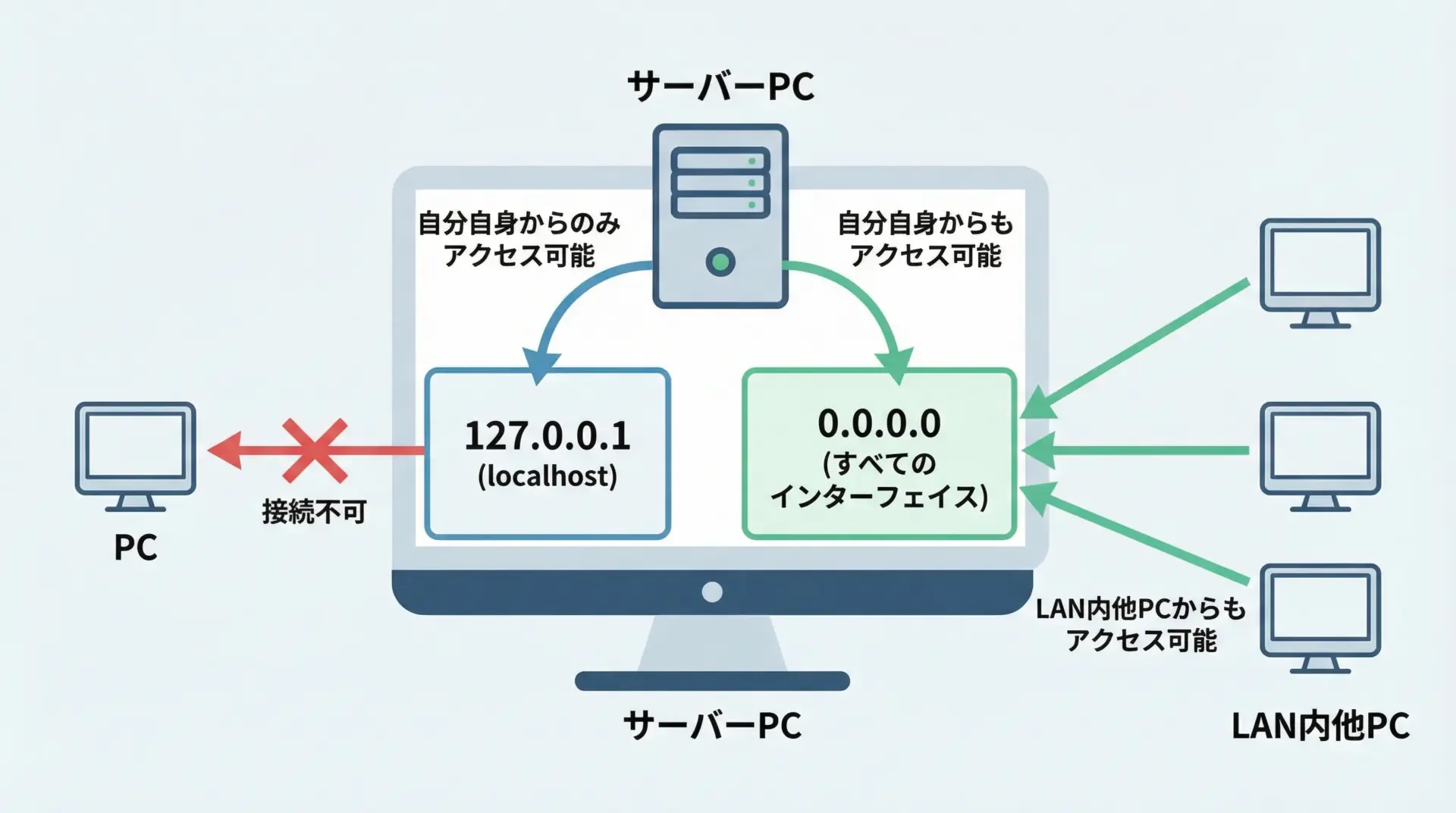 この例では127.0.0.1(localhost)でのみ待ち受けるため、同じPCからしかアクセスできません。