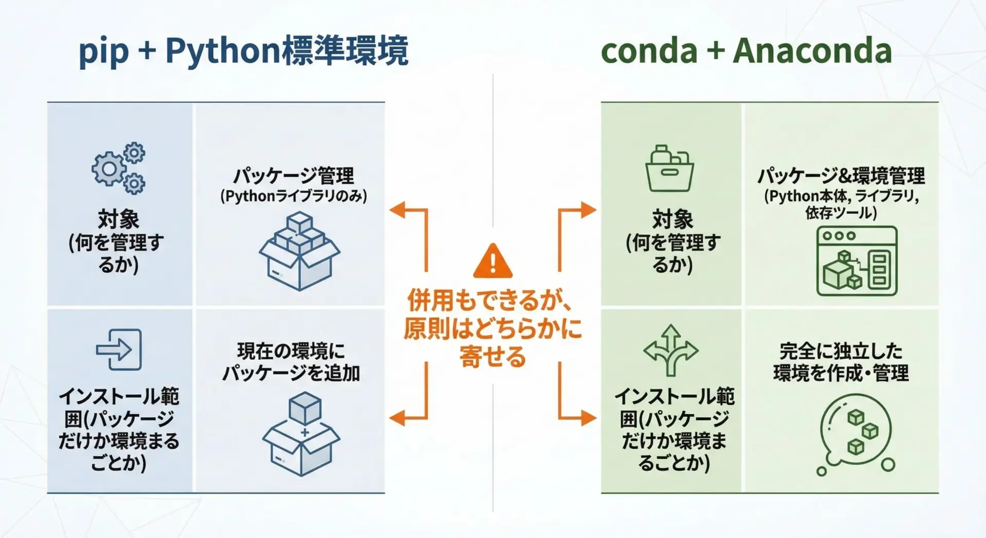 | 項目 | pip | conda(Anaconda) |