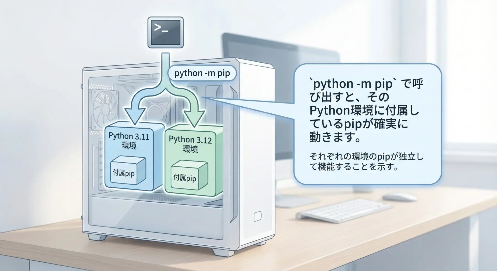 例えば、Python 3.10とPython 3.12を両方インストールしている環境では、それぞれに対応するpipがあり、インストールされるパッケージの場所も異なります。